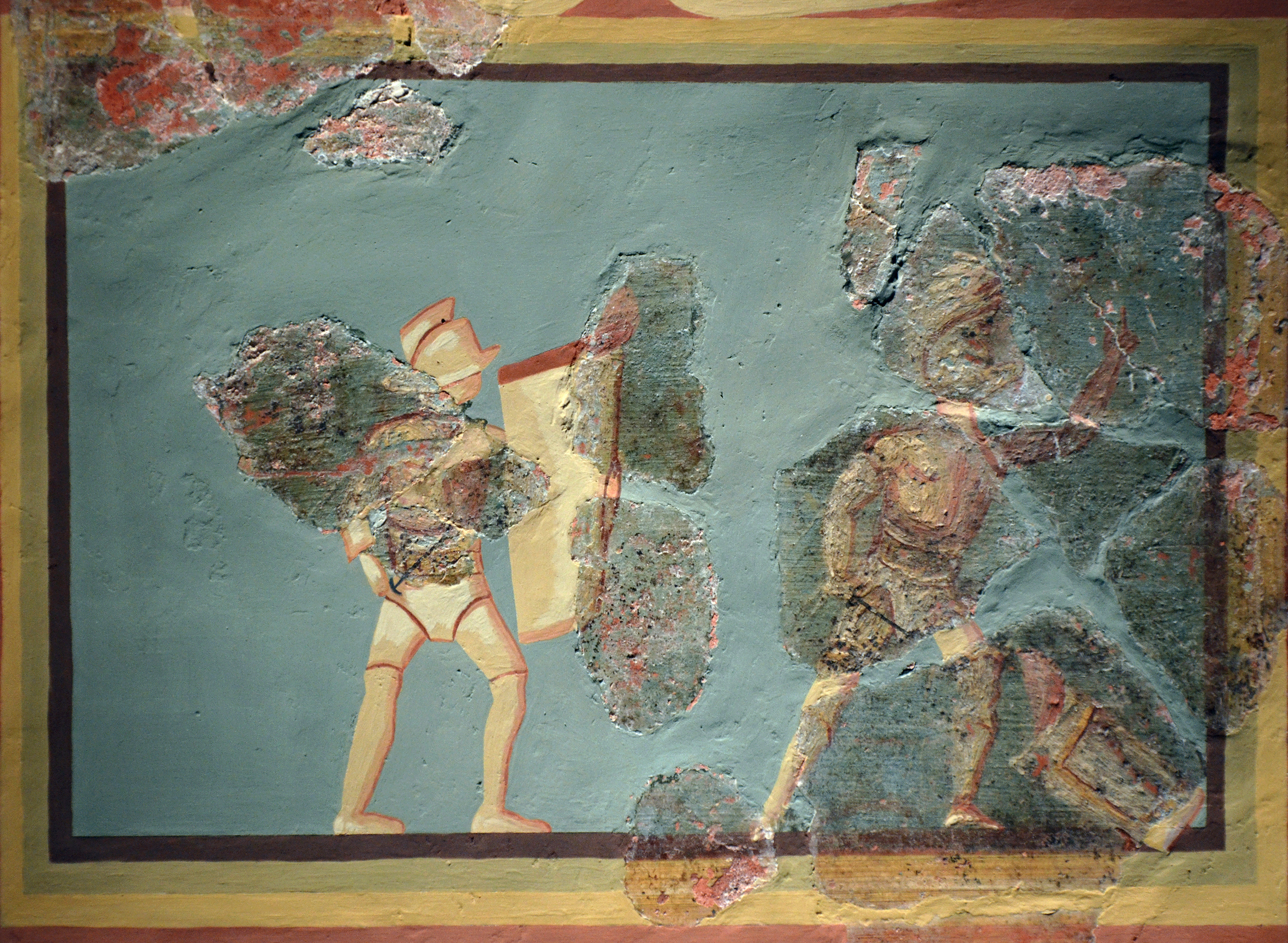This reconstructed piece of wall includes fragments of the original Roman fresco from Camulodunum (Roman Colchester) depicting gladiators. The figure on the right is a defeated murmillo gladiator. He has dropped his shield and has raised his finger to plea for mercy. It is the only known fresco from Britain depicting an arena scene.