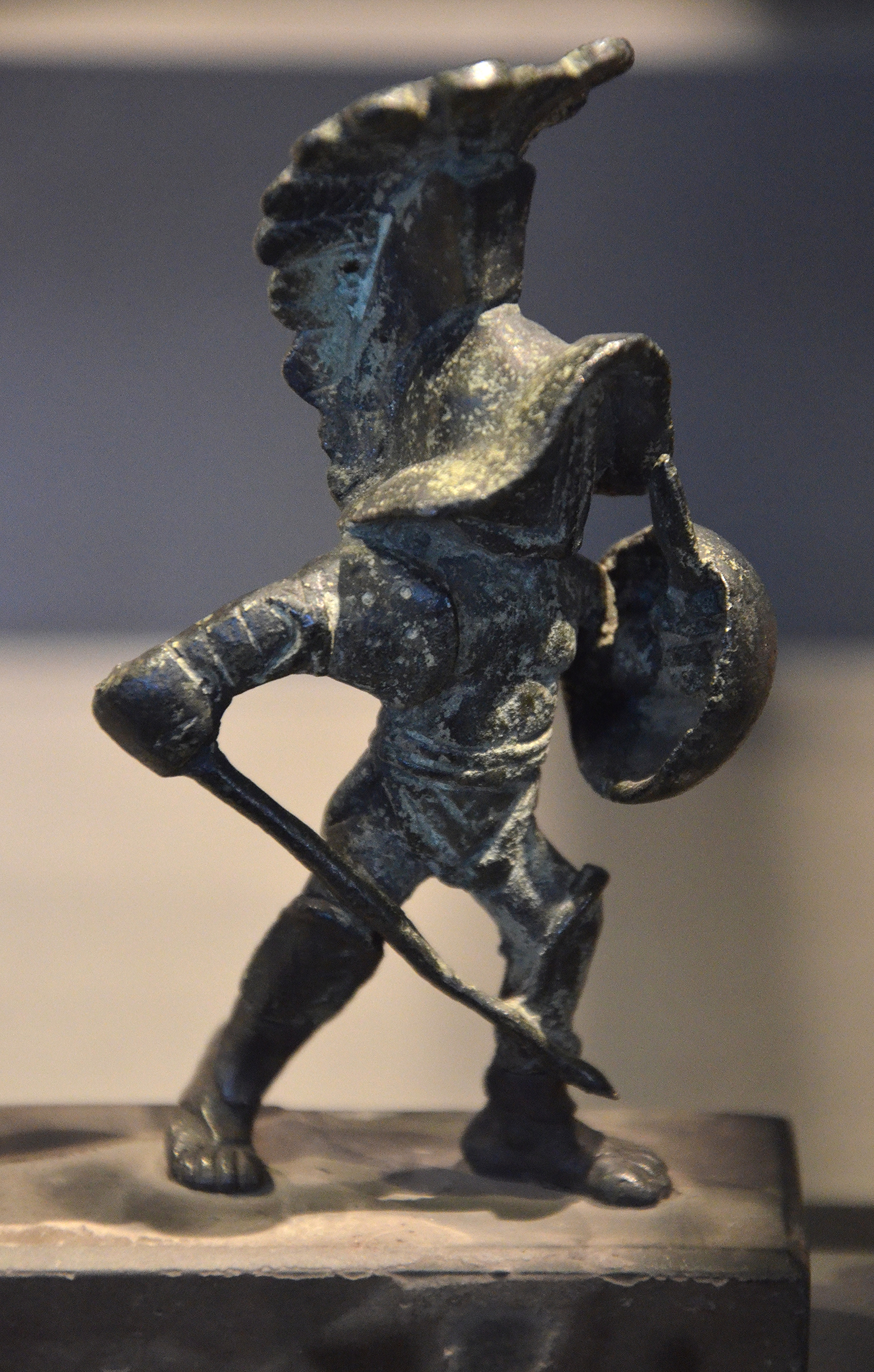 Bronze statuette of a hoplomachus, a type of gladiator in ancient Rome, armed to resemble a Greek hoplite (soldier with heavy armour and helmet, a round shield, a spear, and a sword). The hoplomachus wore a bronze helmet, a manica (armguard) on his right arm, loincloth (subligaculum), heavy padding on his legs, and a pair of high greaves reaching to mid-thigh. 2nd century CE.