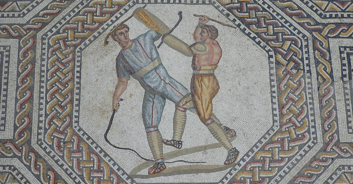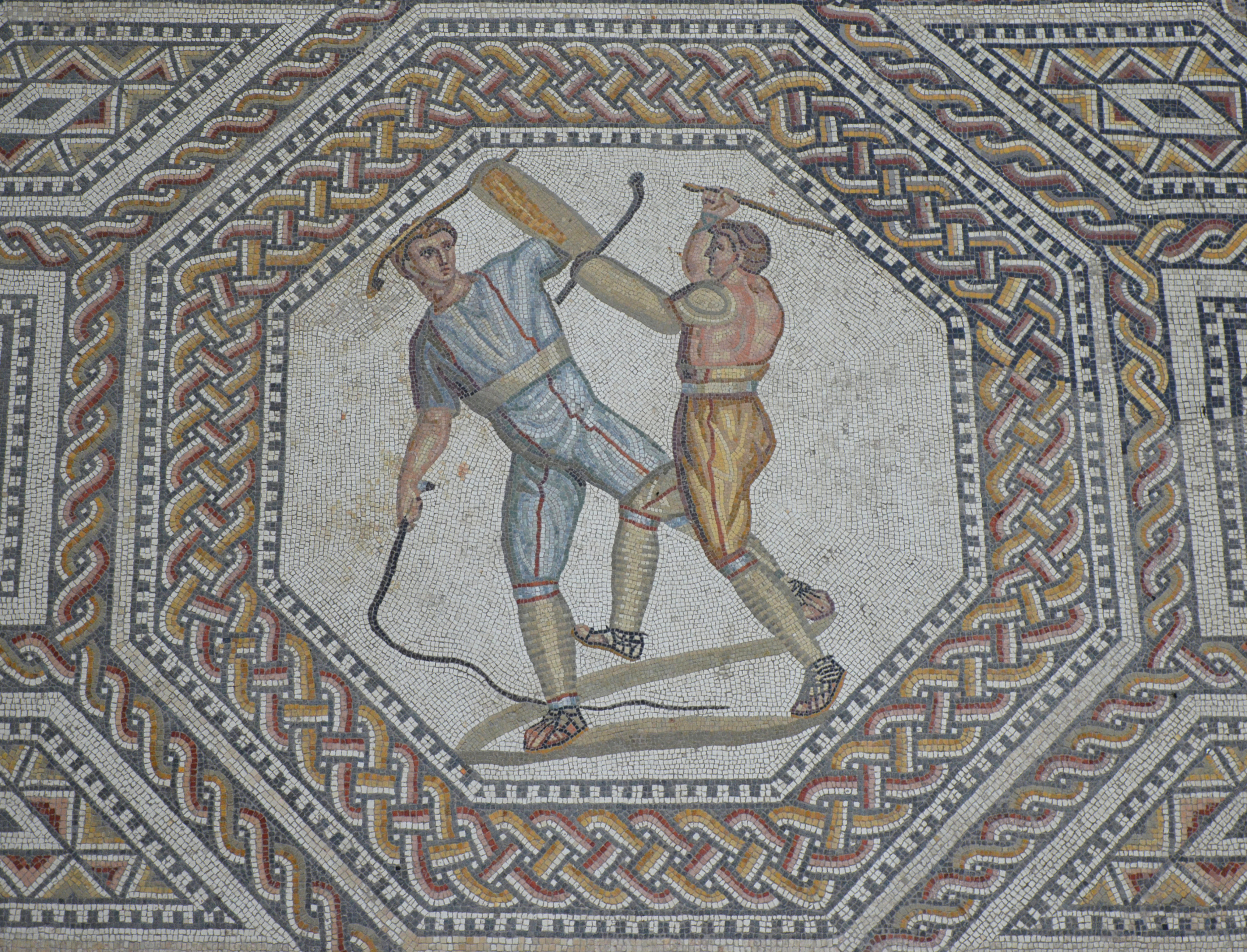 Roman mosaic panel depicting a contest between two combatants attacking one another with cudgels (short, thick sticks used as weapons) and a whip. The introduction to the gladiatorial contests consisted of a prolusio (prelude). The various pairs fought with blunted weapons, giving a foretaste of their skills.
