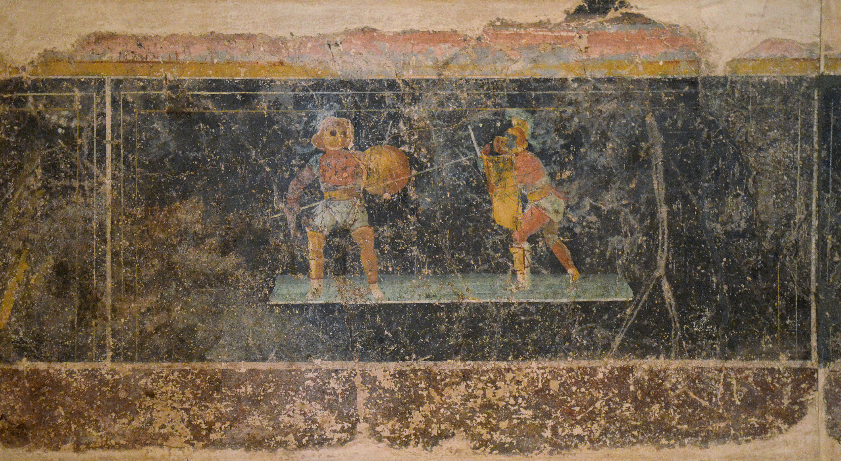 A fresco panel depicting a hoplomachus fighting against a murmillo, from the Roman Villa of Mechern, dated to the 3rd century CE.