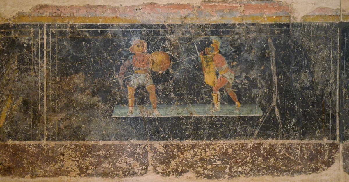 Raddato, C. (2024, June 26). Fresco with a Hoplomachus and a Murmillo. World History Encyclopedia. https://www.worldhistory.org/image/19155/fresco-with-a-hoplomachus-and-a-murmillo/