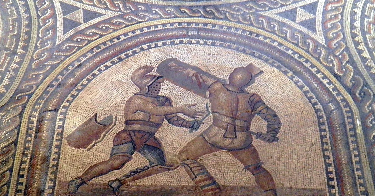 Raddato, C. (2024, June 26). Mosaic with a Thracian and a Murmillo. World History Encyclopedia. https://www.worldhistory.org/image/19156/mosaic-with-a-thracian-and-a-murmillo/