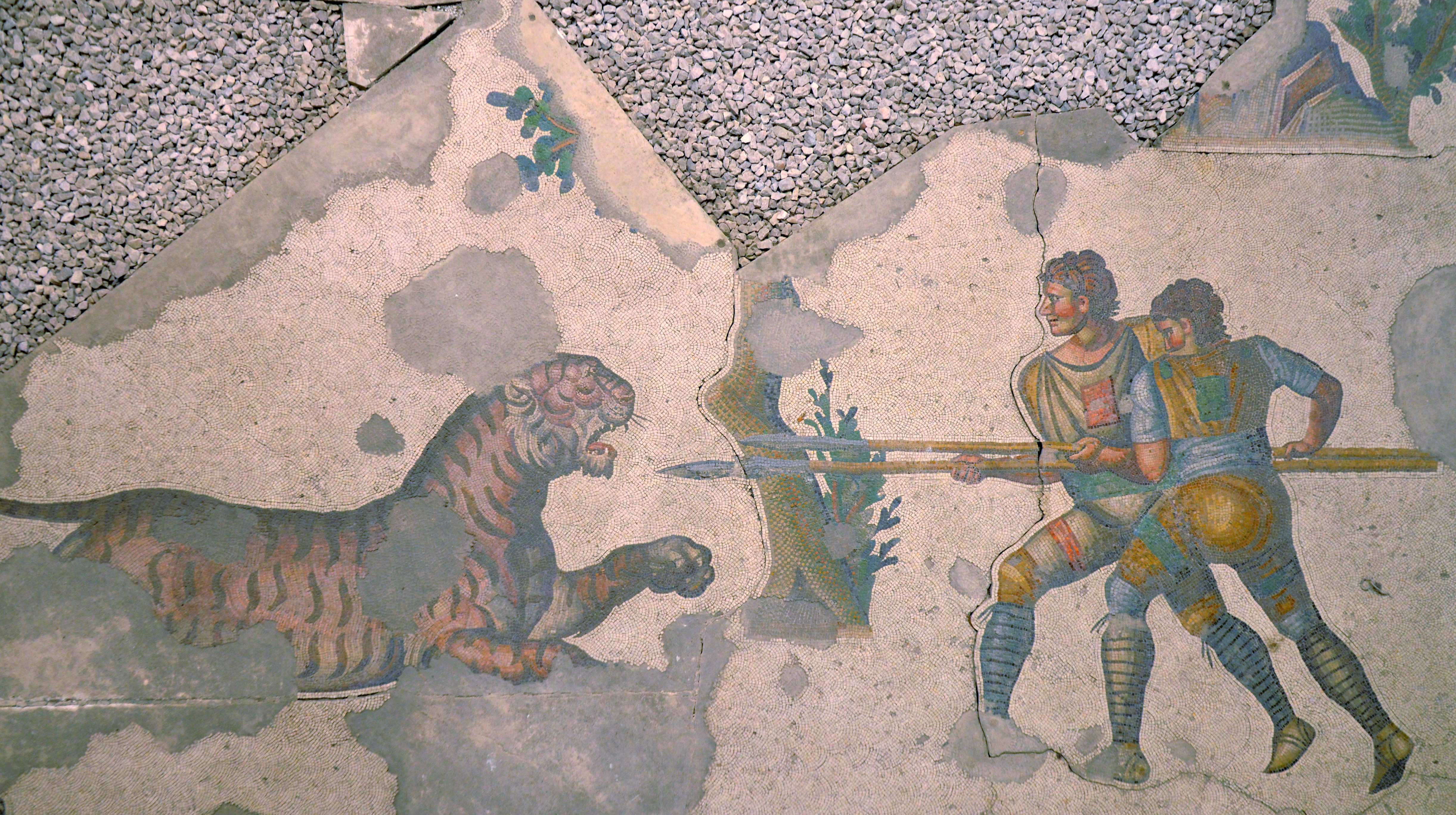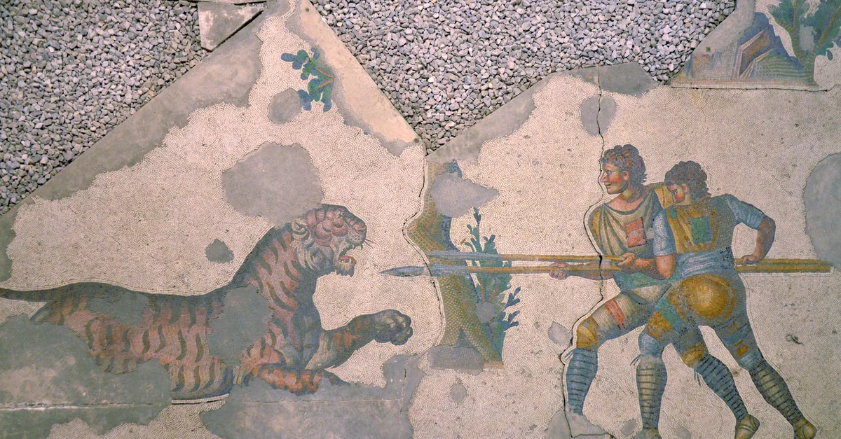 Mosaic floor depicting two venatores hunting a tiger, from Constantinople's Great Palace, 6th century CE.