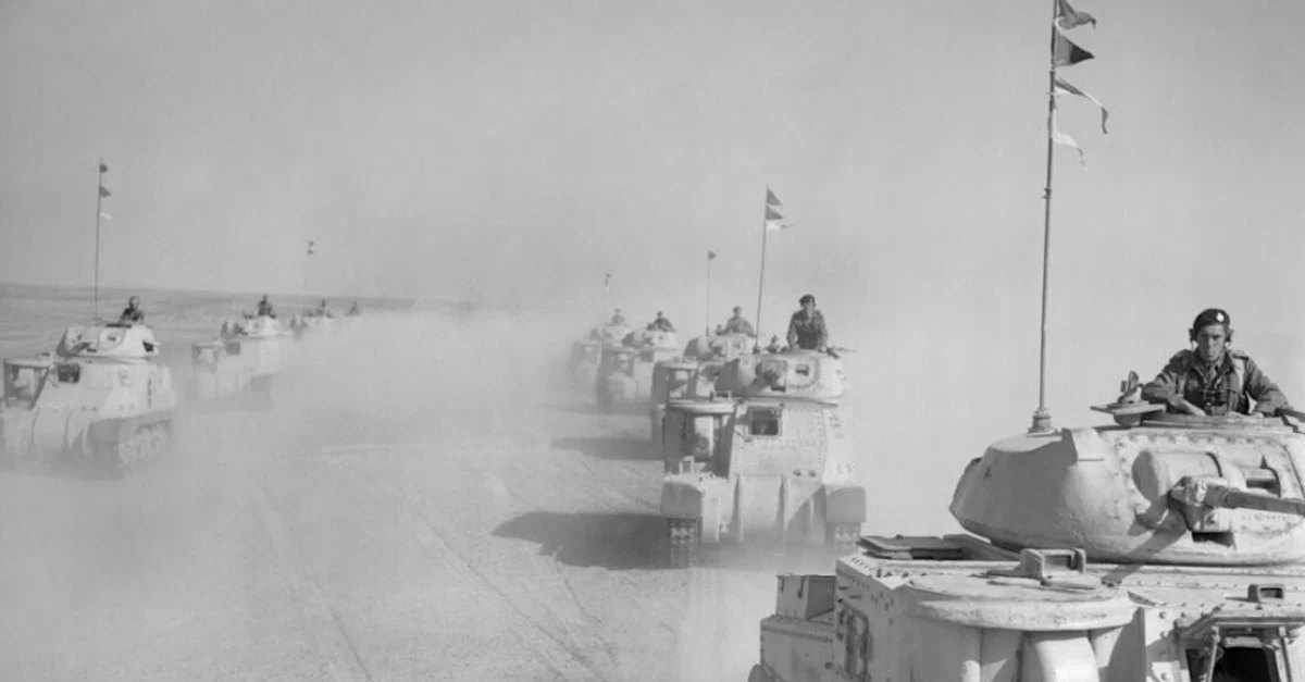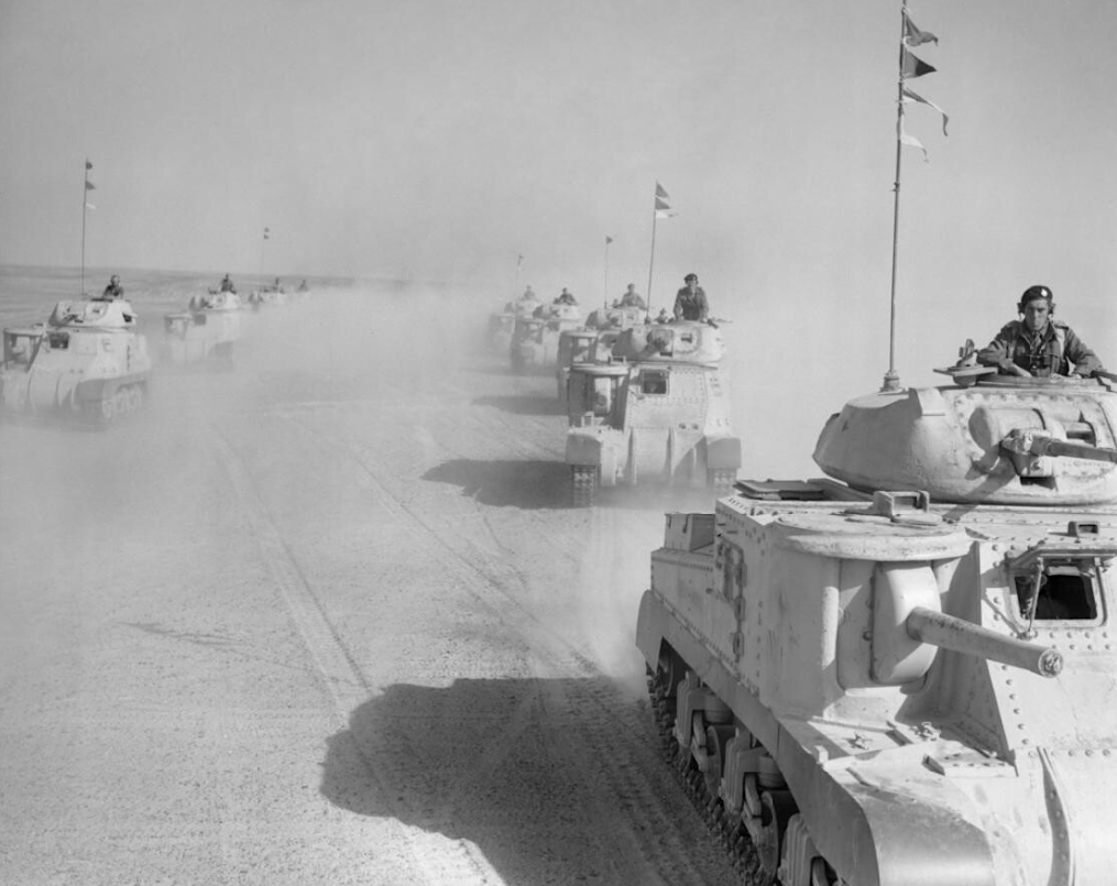 A February 1942 photograph of a column of US-made Grant tanks of the British 5th Royal Tank Regiment during the Western Desert Campaigns of the Second World War (1939-45). (Imperial War Museums)