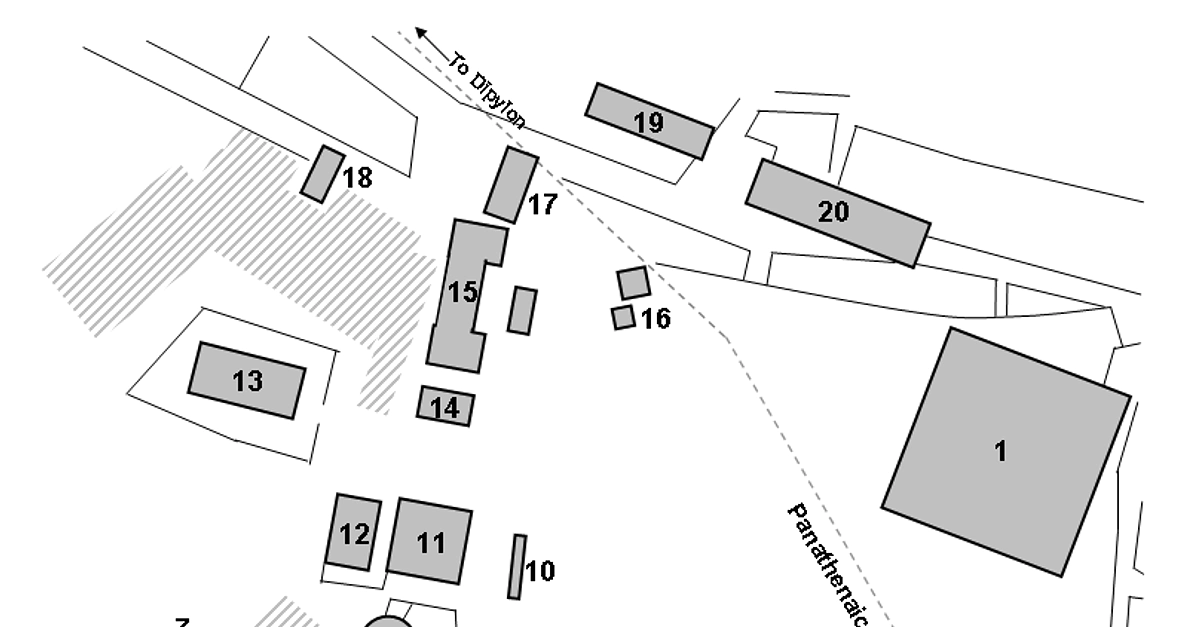 A map of the Athenian Agora in the 5th century BCE. Key 1 Peristylar Court 2 Mint 3 Enneacrounos 4 South stoa 5 Heliaea 6 Strategeion 7 Colonos Agoraios 8 Tholos 9 Agora stone 10 Monument of the Eponymous Heroes 11 Old Bouleuterion 12 New Bouleuterion 13 Temple of Hephaestus (Hephaestion) 14 Temple of Apollo Patroos 15 Stoa of Zeus 16 Altar of the Twelve Gods 17 Royal stoa 18 Temple of Aphrodite Urania 19 Stoa of Hermes 20 Stoa poikile