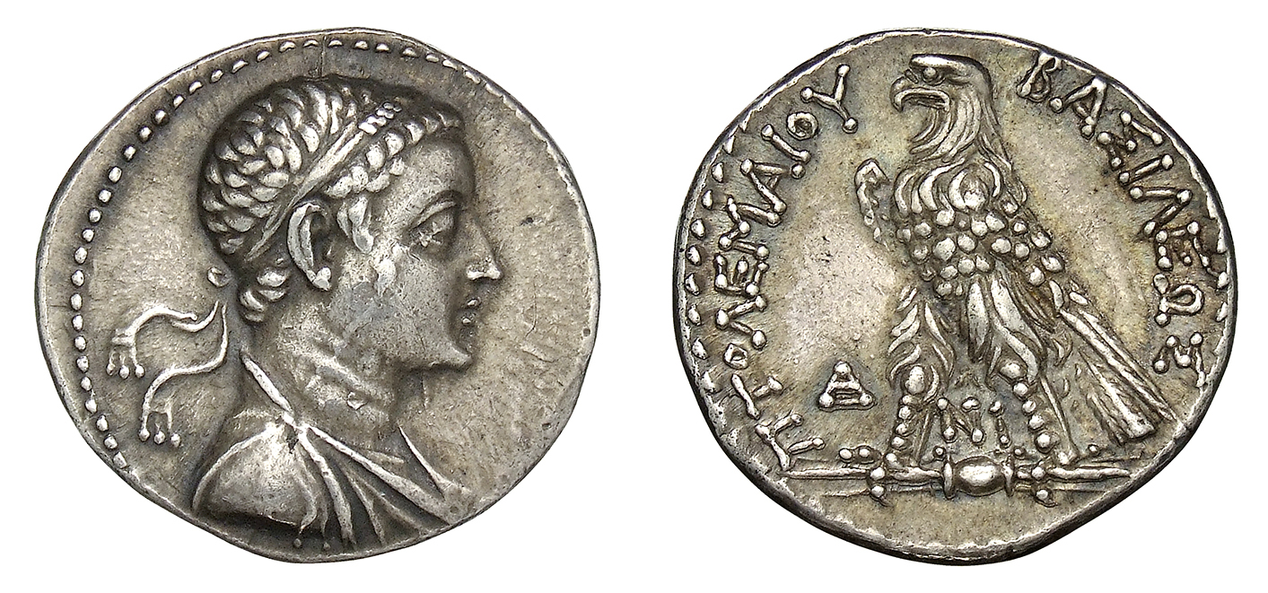 Tetradrachm of Ptolemy V Epiphanes (r. 205-180 BCE). Portrait of Ptolemy on obverse, Ptolemaic eagle on reverse with the legend "Ptolemy Basileus" (meaning "King Ptolemy"). Minted in Phoenicia.