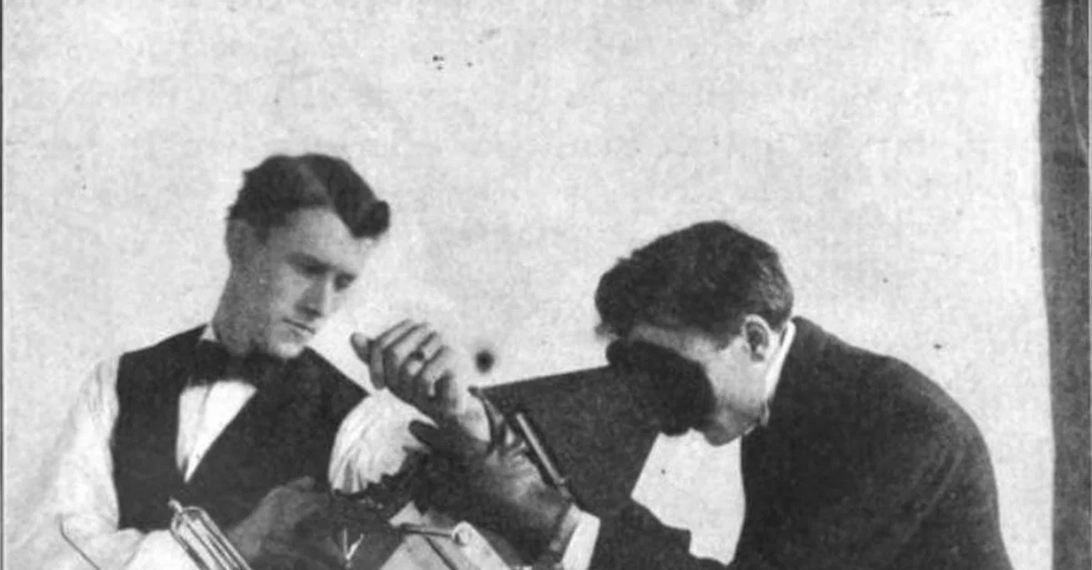 Photo of an early X-ray procedure using a fluoroscope screen, around 1910. No precautions were taken to minimise exposure since the dangers of X-rays were not known at the time.