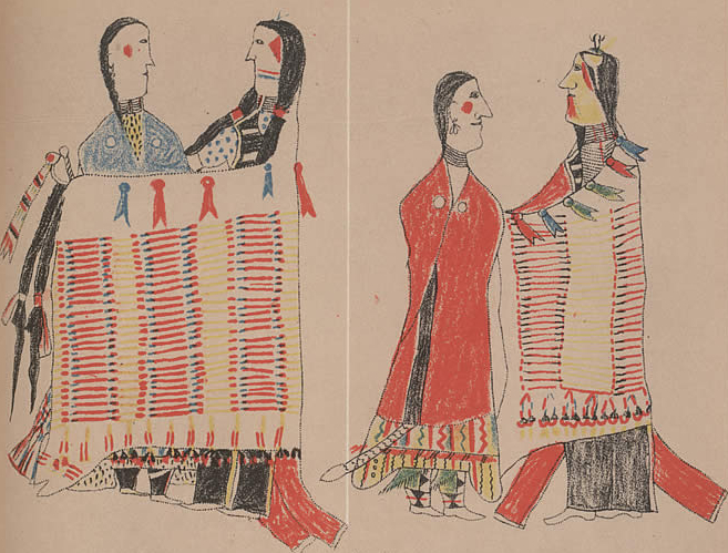 Cheyenne courting scenes by the Cheyenne artist Big Back, c. 1882. The scenes depict the sort of courtship ritual and acceptance of a proposed marriage as touched on in the Ehyophsta Legend of the Cheyenne when Coyote Man offers his daughter in marriage to the two young men.
