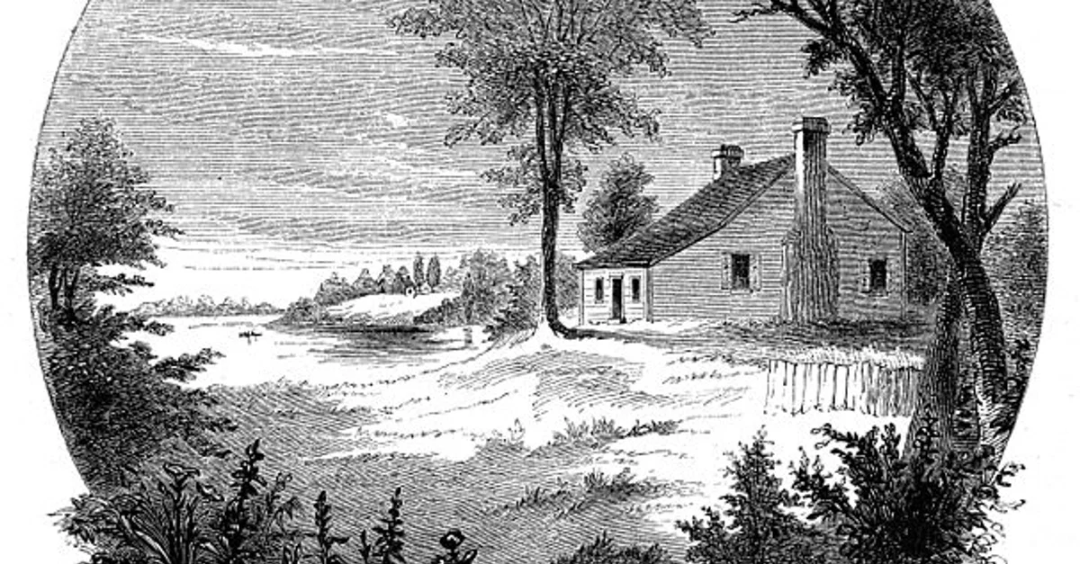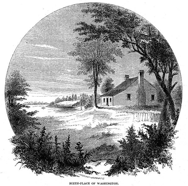 An engraving of the Wakefield house on Pope's Creek, Virginia, the birthplace of George Washington. Engraving by Benson J. Lossing & William Barritt, 1856, digitalized by Centpacrr, 2013.
