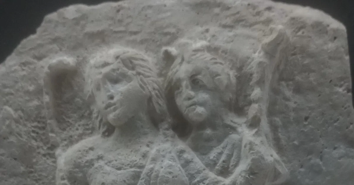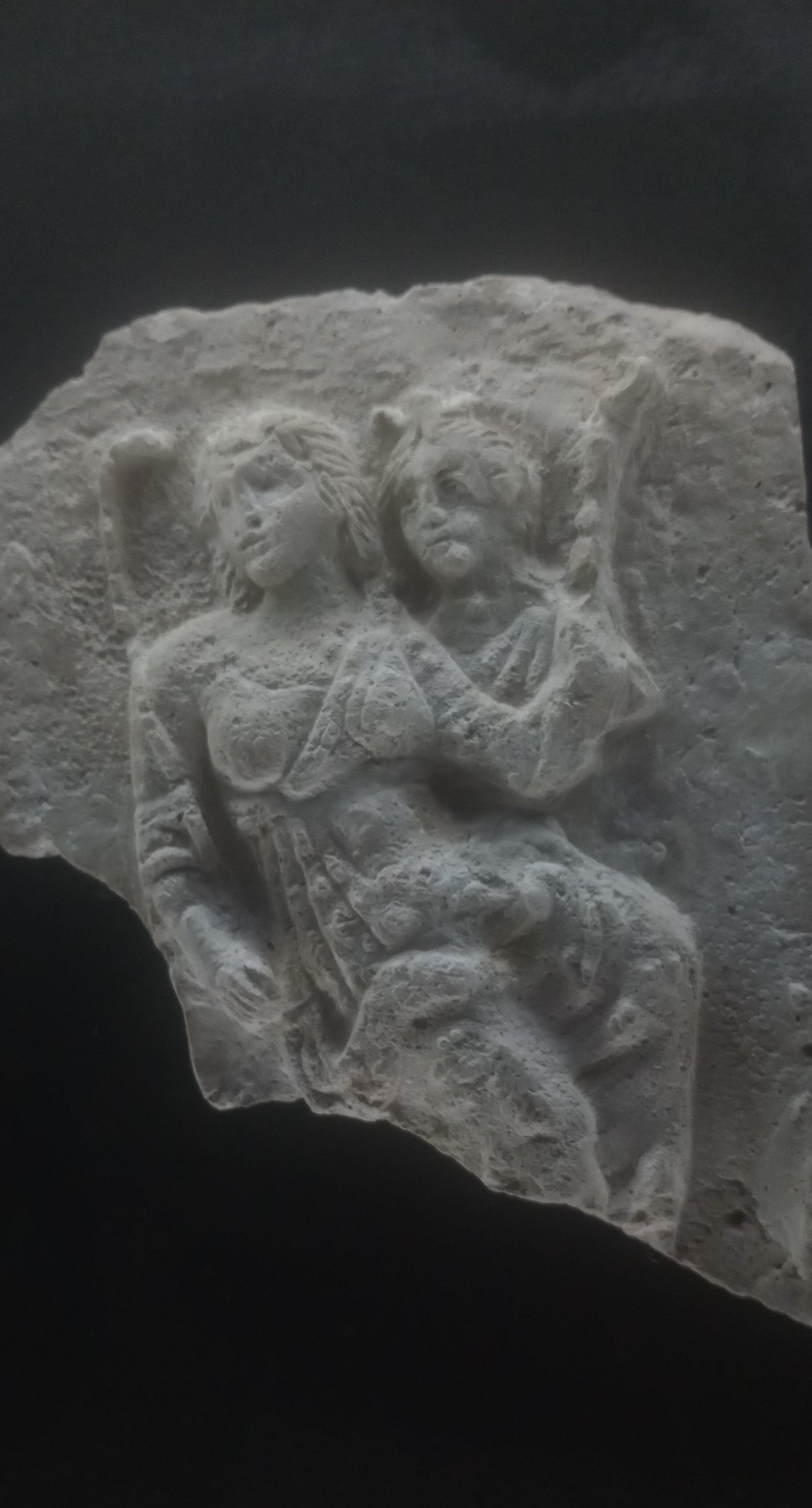 A Roman stucco medallion depicting two female figures, from Torre de la Cruz/Xauxelles (Villajoyosa), Alicante, Spain, 3rd-4th century.