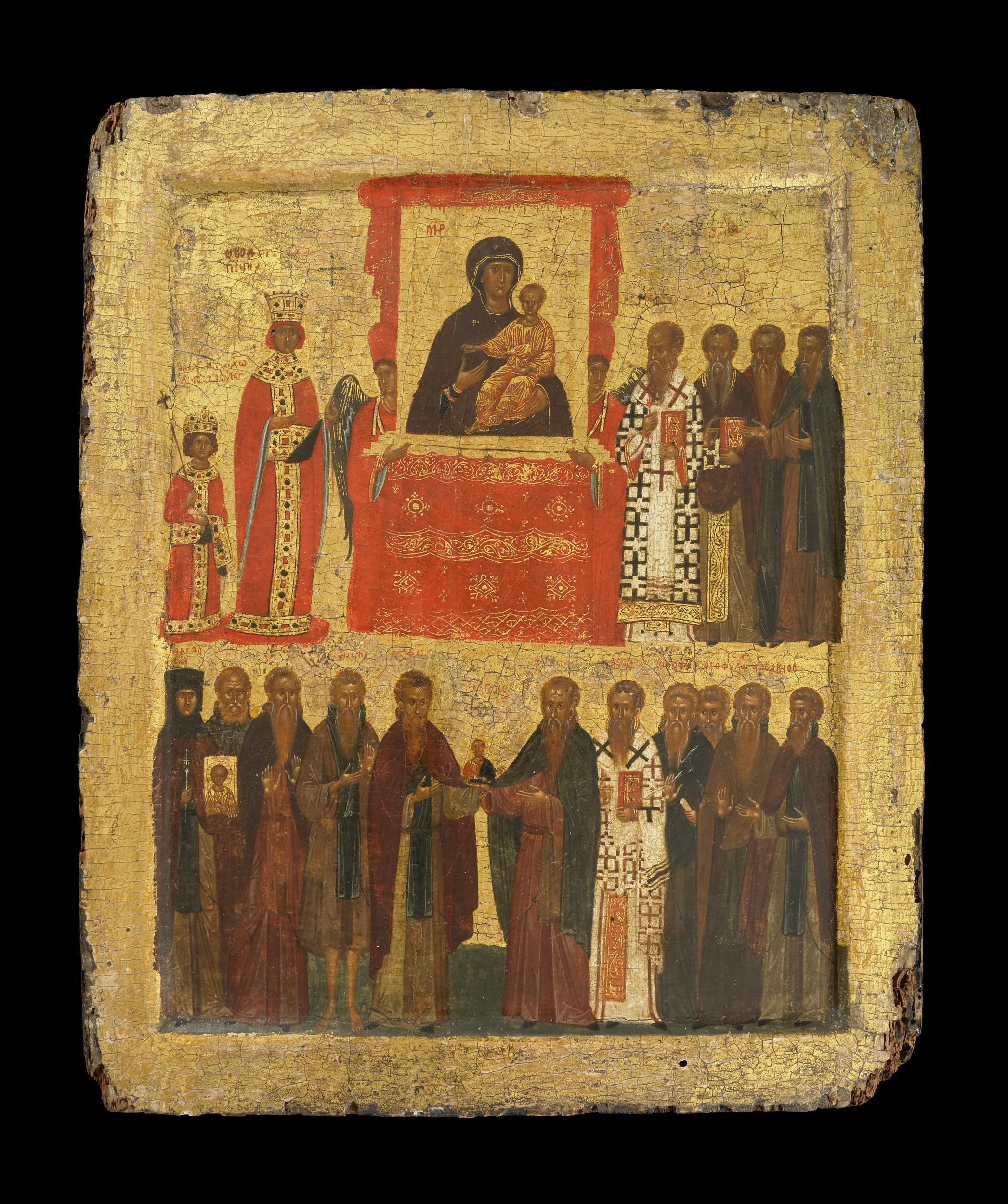 The icon shows the Triumph of Orthodoxy, the restoration of images in 843 after the period of Iconoclasm (or Iconomachy), characterized by the controversy between the Iconophiles, who promoted icons, and Iconoclasts (or Iconodules), who opposed icons. The image depicts a procession of important figures of the pro-icon faction and itself features an icon of the Virgin Hodegetria.