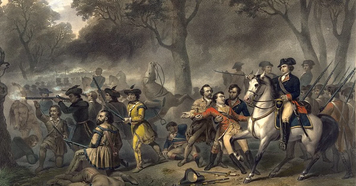 George Washington (right, on horseback) rallies the British troops at the Battle of the Monongahela (9 July 1755), also known as Braddock's Defeat, during the French and Indian War (1754-1763). Originally named Washington the Soldier, oil on canvas painting is by Reǵnier, 1834.