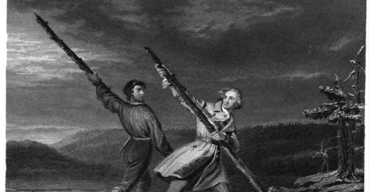 George Washington and his guide Christopher Gist cross the Alleghany River on a raft in late December 1753; after falling overboard, Washington is saved from drowning by Gist. By Daniel Huntington, 1845.