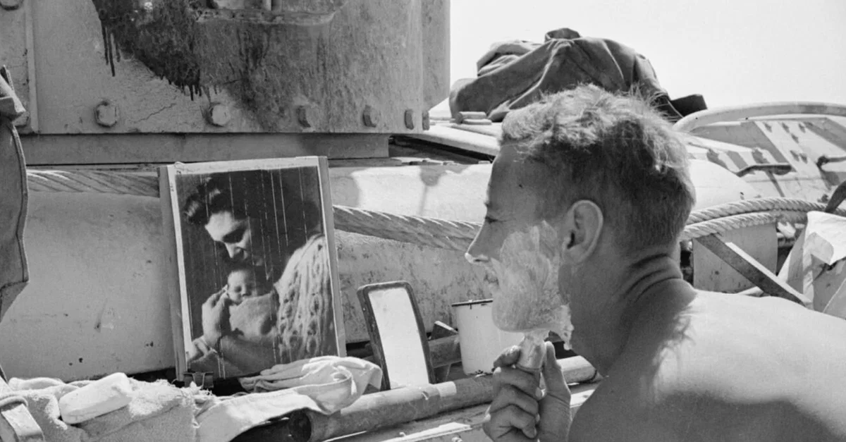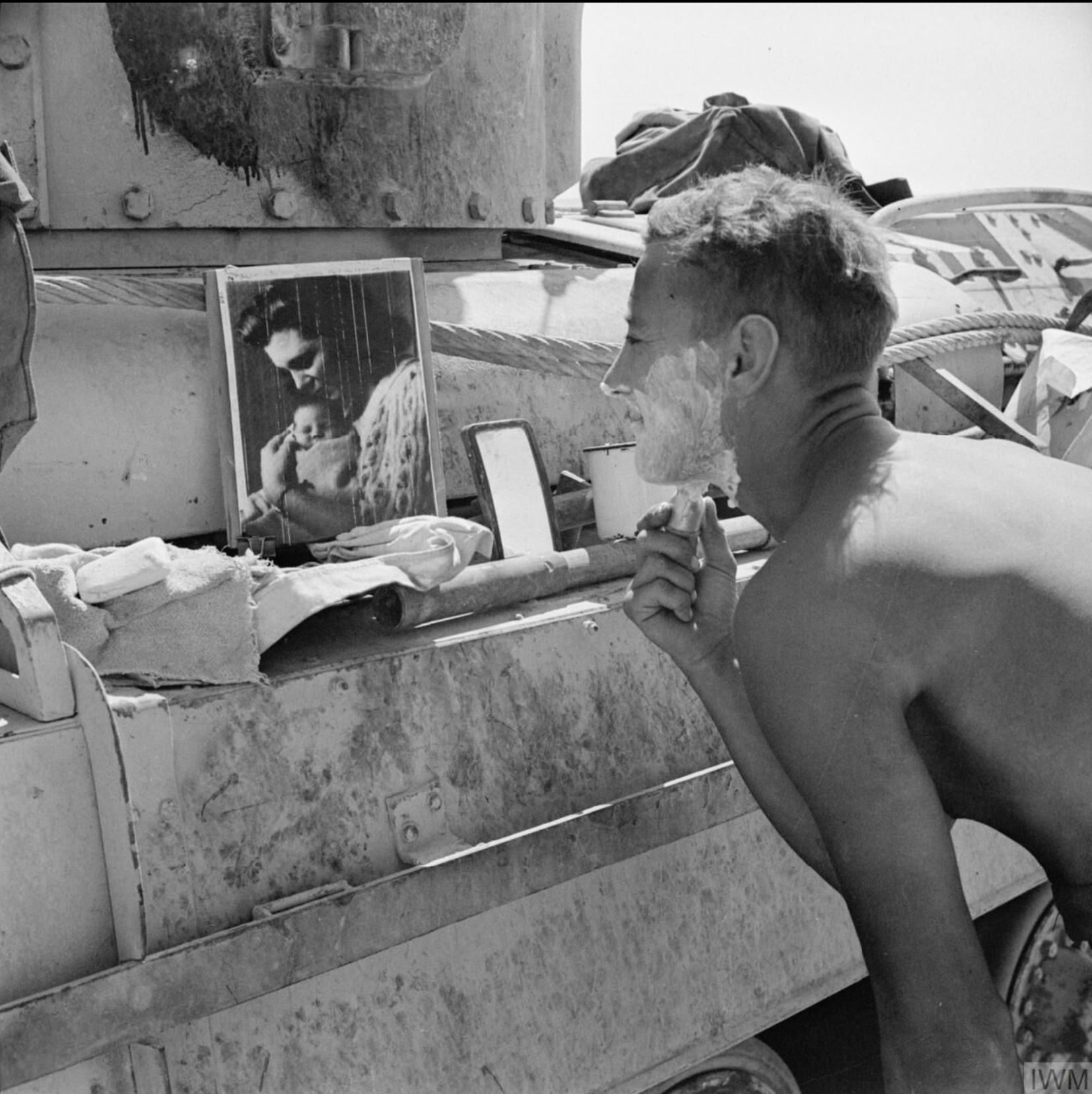A 1942 photograph of a British tank regiment soldier shaving in the desert in North Africa during the Western Desert Campaigns of the Second World War (1939-45). (Imperial War Museums)