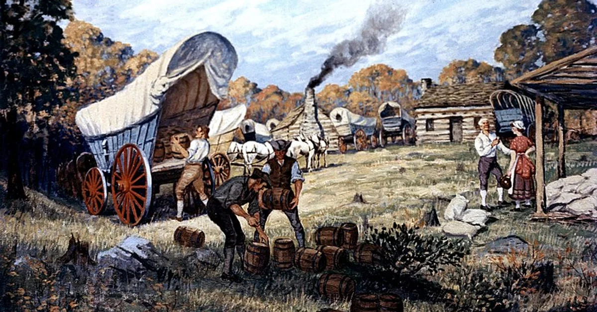 Pennsylvania farmers load up barrels of whiskey for sale, around the time of the Whiskey Rebellion, 1794. Painting by Carl Rakeman