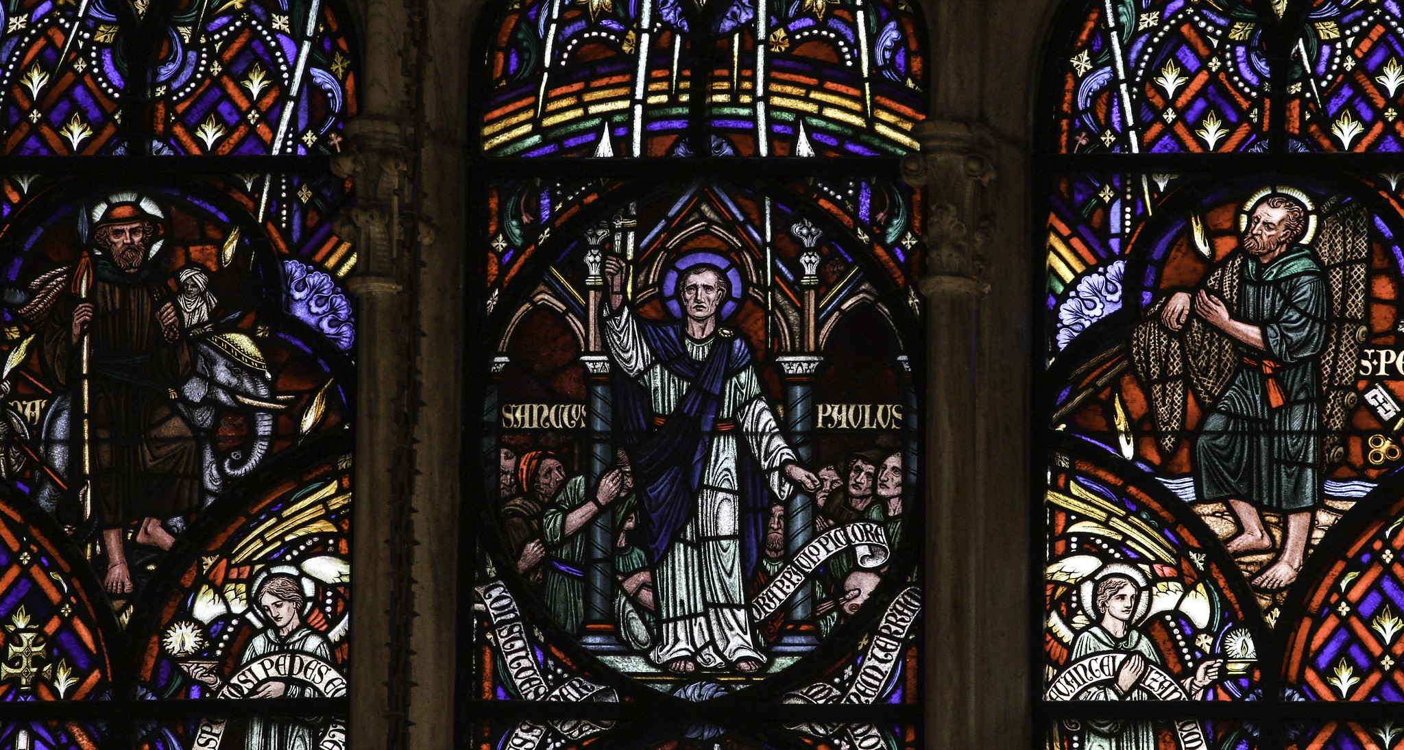 Saint Paul preaching, stained glass from St Patrick's Cathedral, New York.