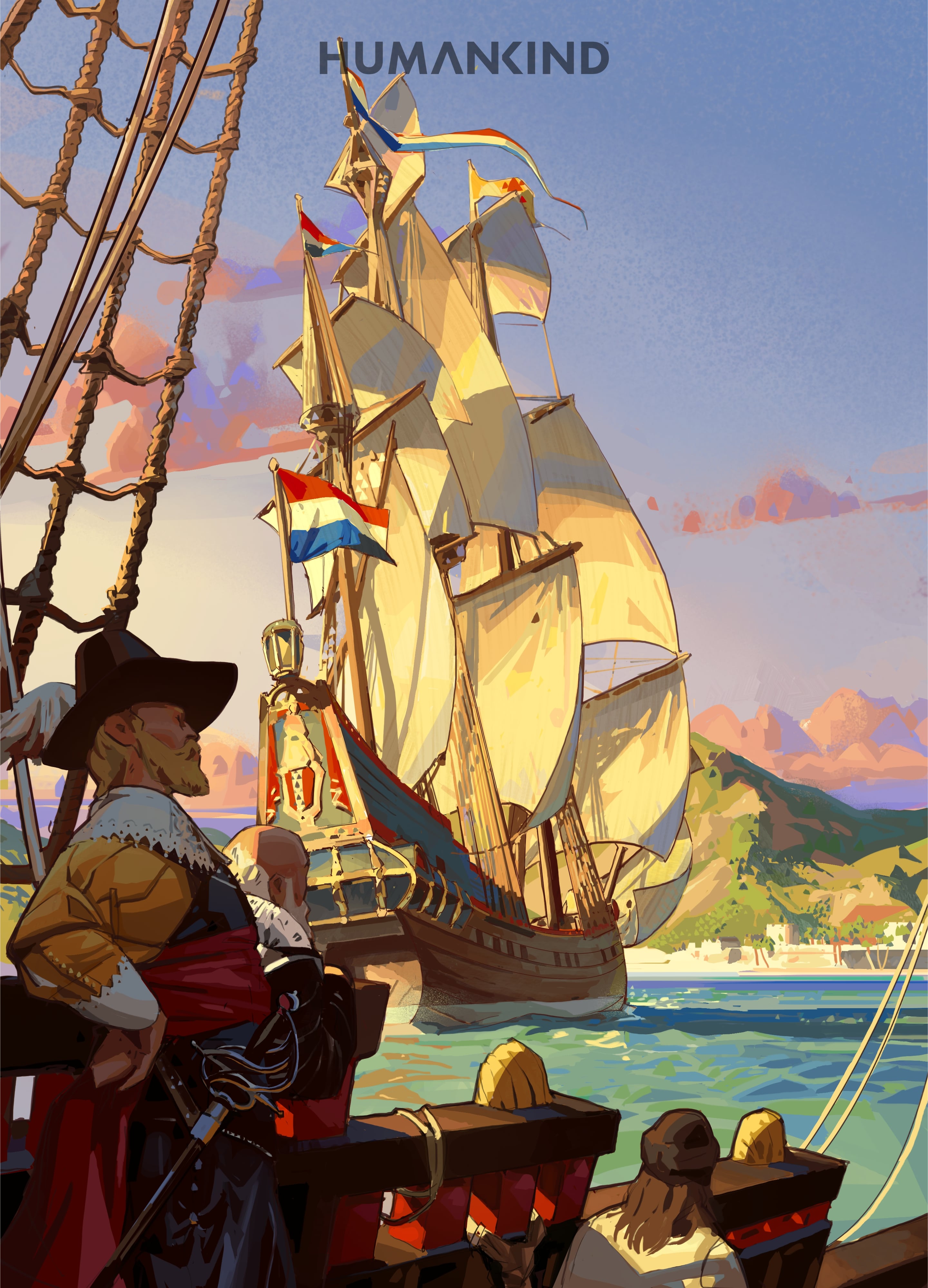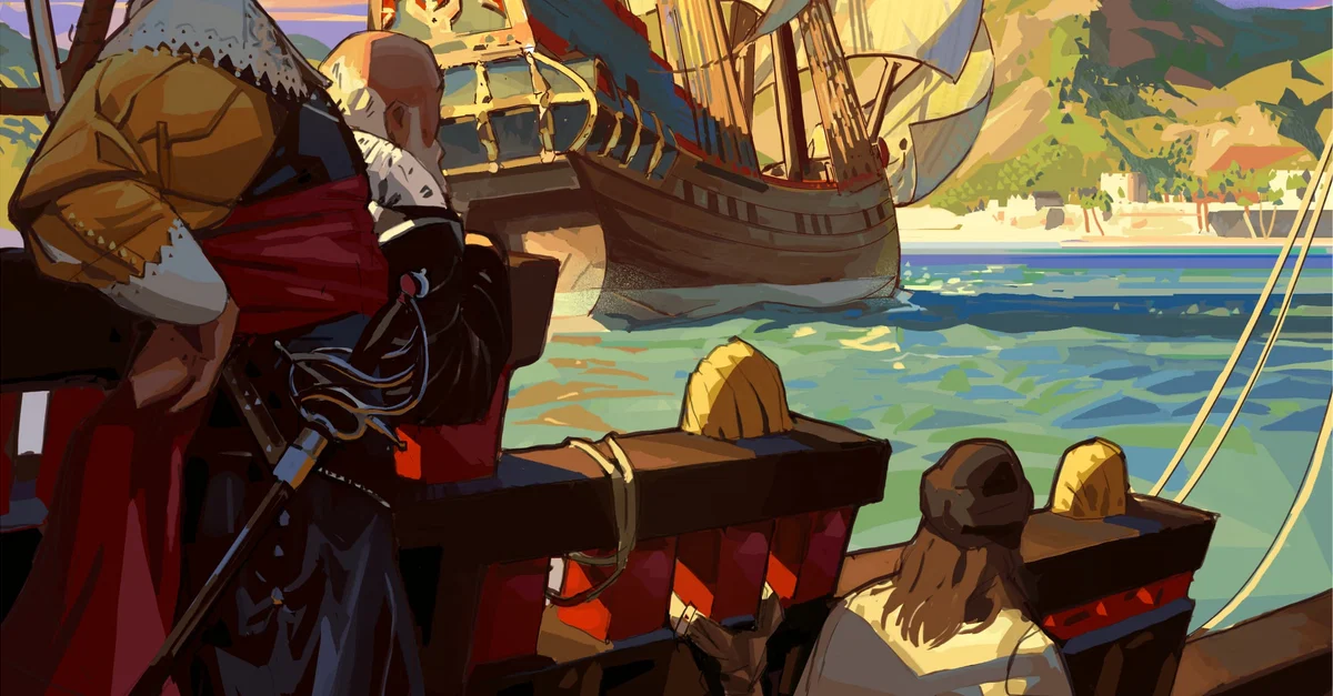Artist's impression of Dutch explorers meeting a French ship near the coastline, with a port town and mountains in the background. Created by Amplitude Studios for the video game Humankind.