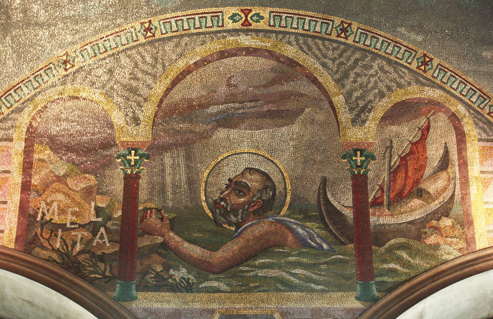 Saint Paul swimming to Malta from the wrecked ship, mosaic designed by Boris Anrep in 1961, put together by Peter Indri in 1964-5.