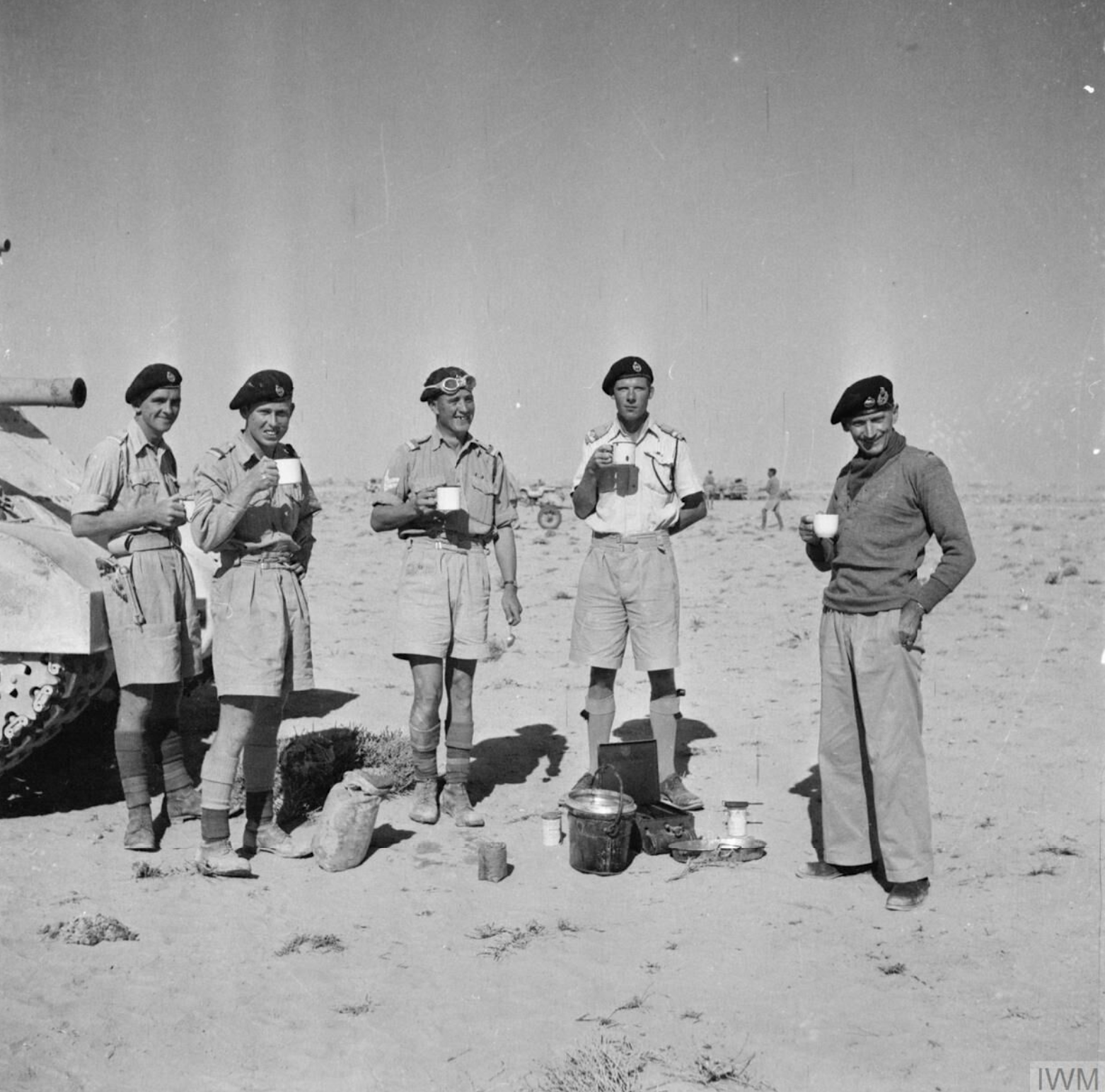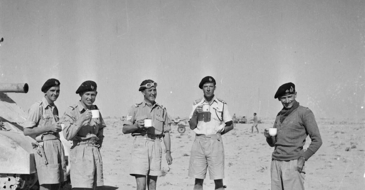A photograph of British General Bernard Montgomery (1887-1976) having a break with his tank protection crew shortly after the Second Battle of El Alamein (Oct-Nov 1942) during the Western Desert Campaigns (June 1940 to January 1943) in North Africa. (Imperial War Museums)