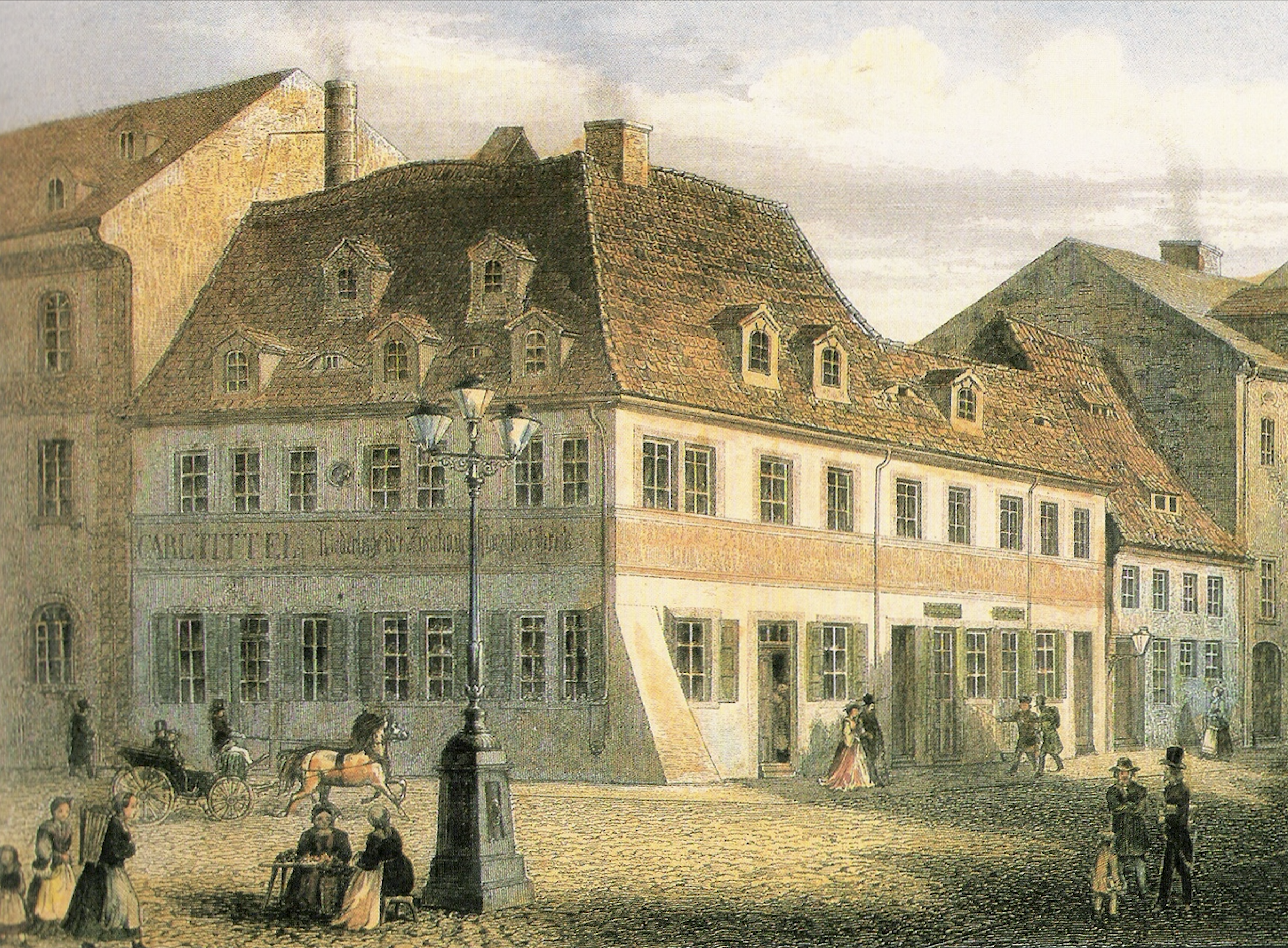 A lithographic print of the house where the composer Robert Schumann (1810-1856) was born in Zwickau, Saxony, Germany. The house is today a museum dedicated to the composer.