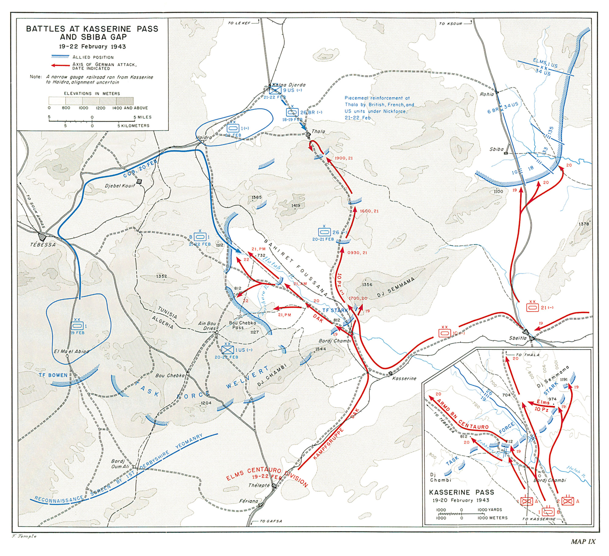 A map of the troop movements of the Battle of Kasserine Pass in Tunisia, February 1943. The Allies lost this battle against Axis forces during the North Africa Campaign (1942-3). (United States Department of Defense)