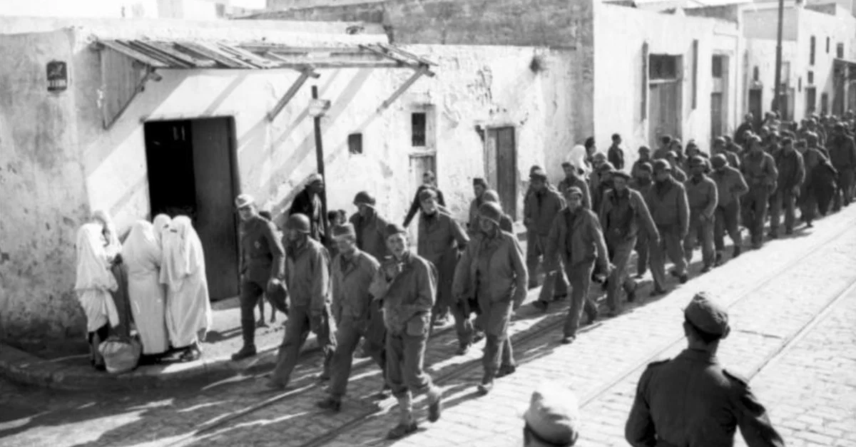 A photograph showing US prisoners-of-war after the Battle of Kasserine Pass in Tunisia, February 1943. The Allies lost this battle against Axis forces during the North Africa Campaign (1942-3). (German Federal Archives)