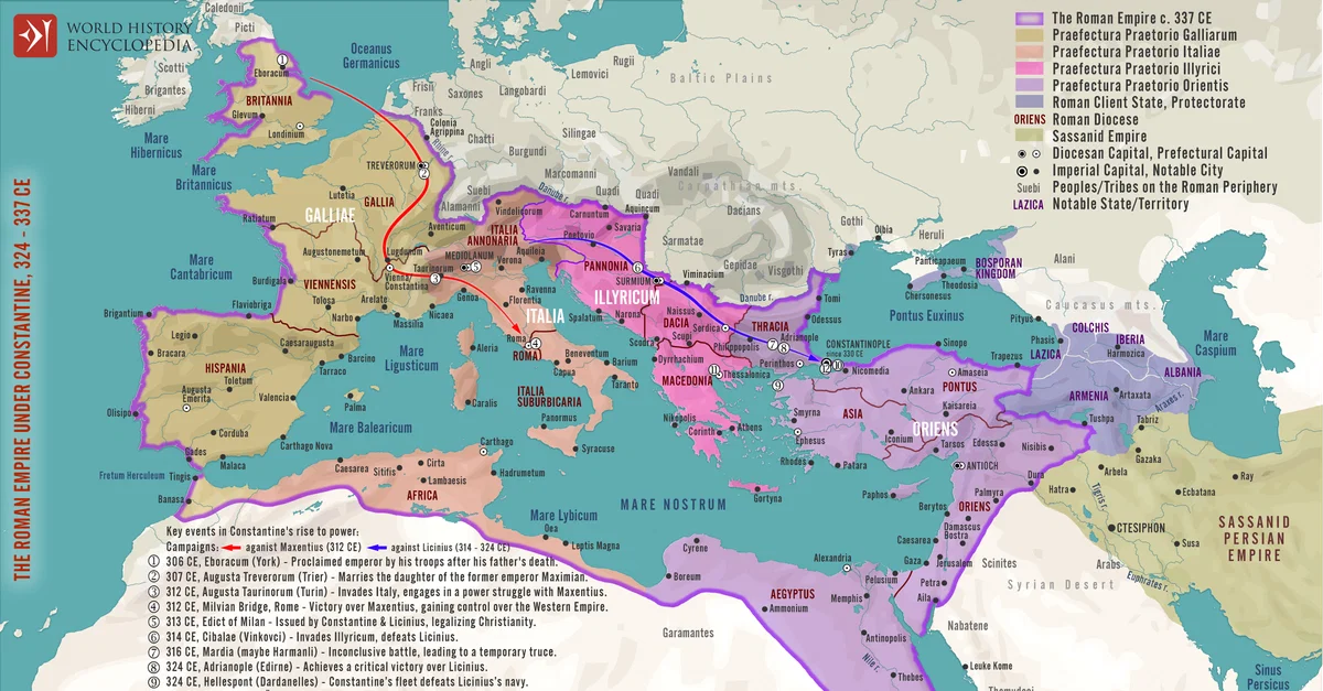 Netchev, S. (2024, August 26). Roman Empire under Constantine, 324-337 CE. World History Encyclopedia. https://www.worldhistory.org/image/19366/roman-empire-under-constantine-324-337-ce/