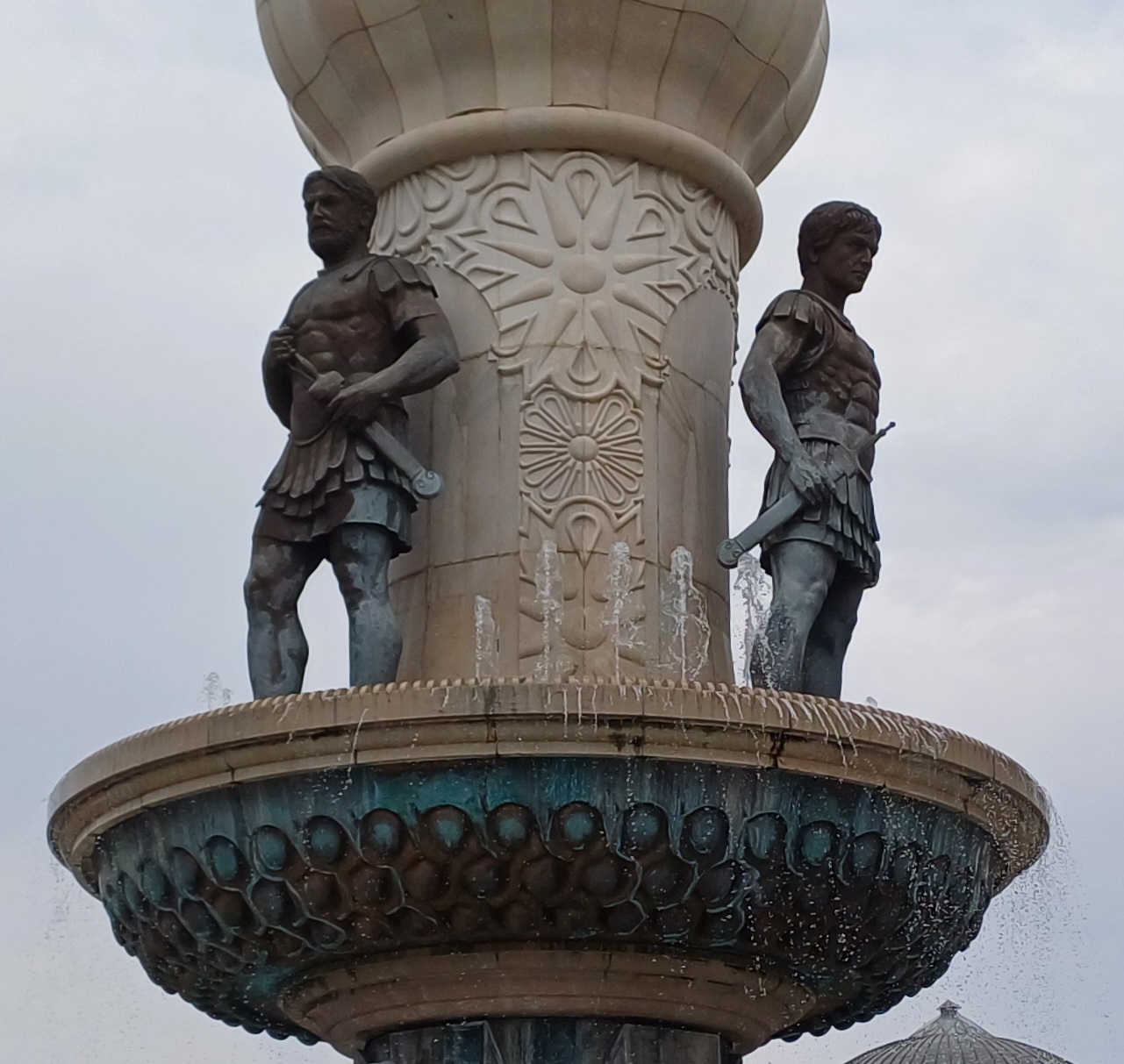 The Skopje 2014 (2010-2014) was a project involving the construction of 136 monumental buildings, bridges, statues, and fountains in the capital of North Macedonia to celebrate and promote the cultural heritage and history of the country. A highlight of this project was the erection of a gigantic, 13-meter-tall bronze statue of Philip II of Macedon on the top of a 16-meter-high marble pedestal set in a large marble fountain pool at Rebellion Square, the entrance to the Old Bazaar. The monument consists of several other colossal statues, including Philip II and Alexander III in the second tier and a family group of Philip, Alexander, and Olympias at the lower level. Made in Vicenza, the monument was originally called Warrior to make it distinctive from the equestrian sculpture of Philip II a few metres further by the Stone Bridge in Skopje city centre.