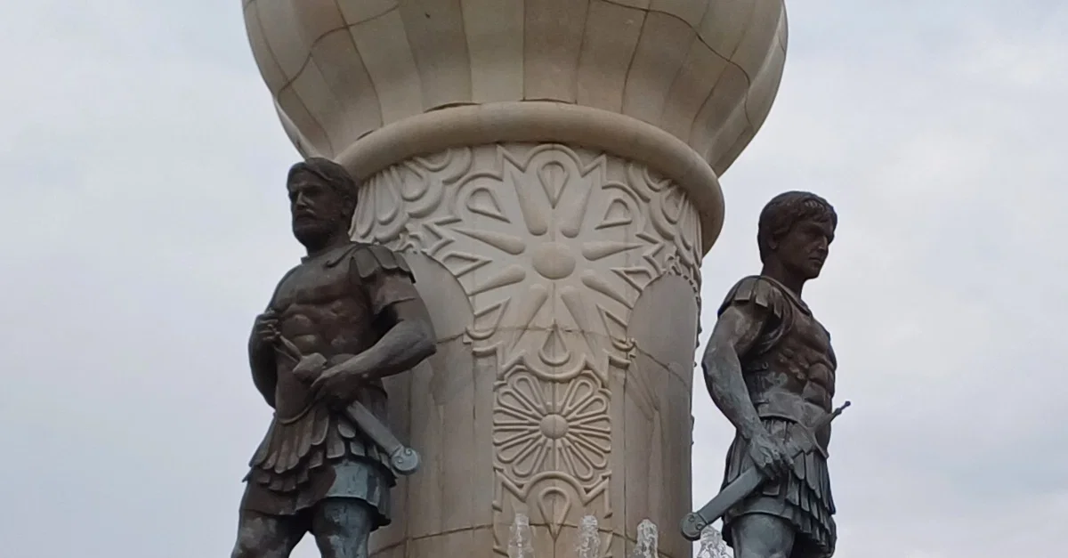 Colossal statues of Philip II of Macedon (r. 359-336 BCE) and Alexander the Great (r. 336-323 BCE) in Skopje.