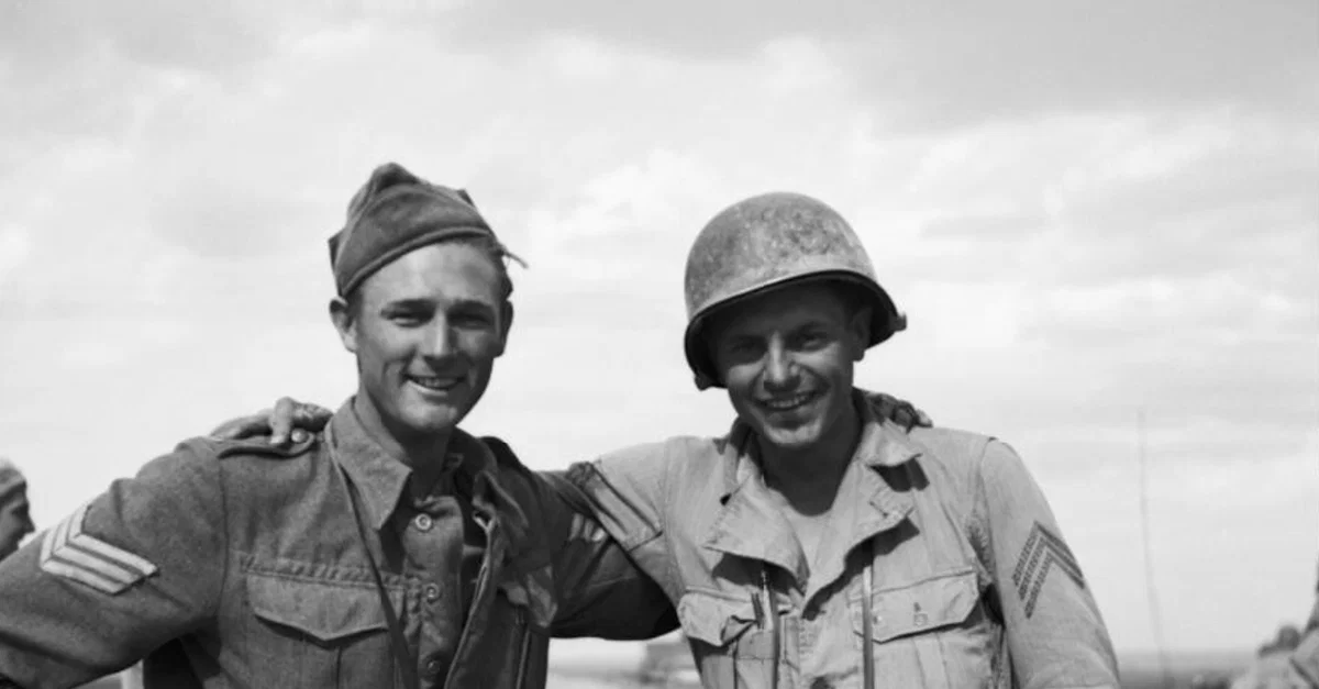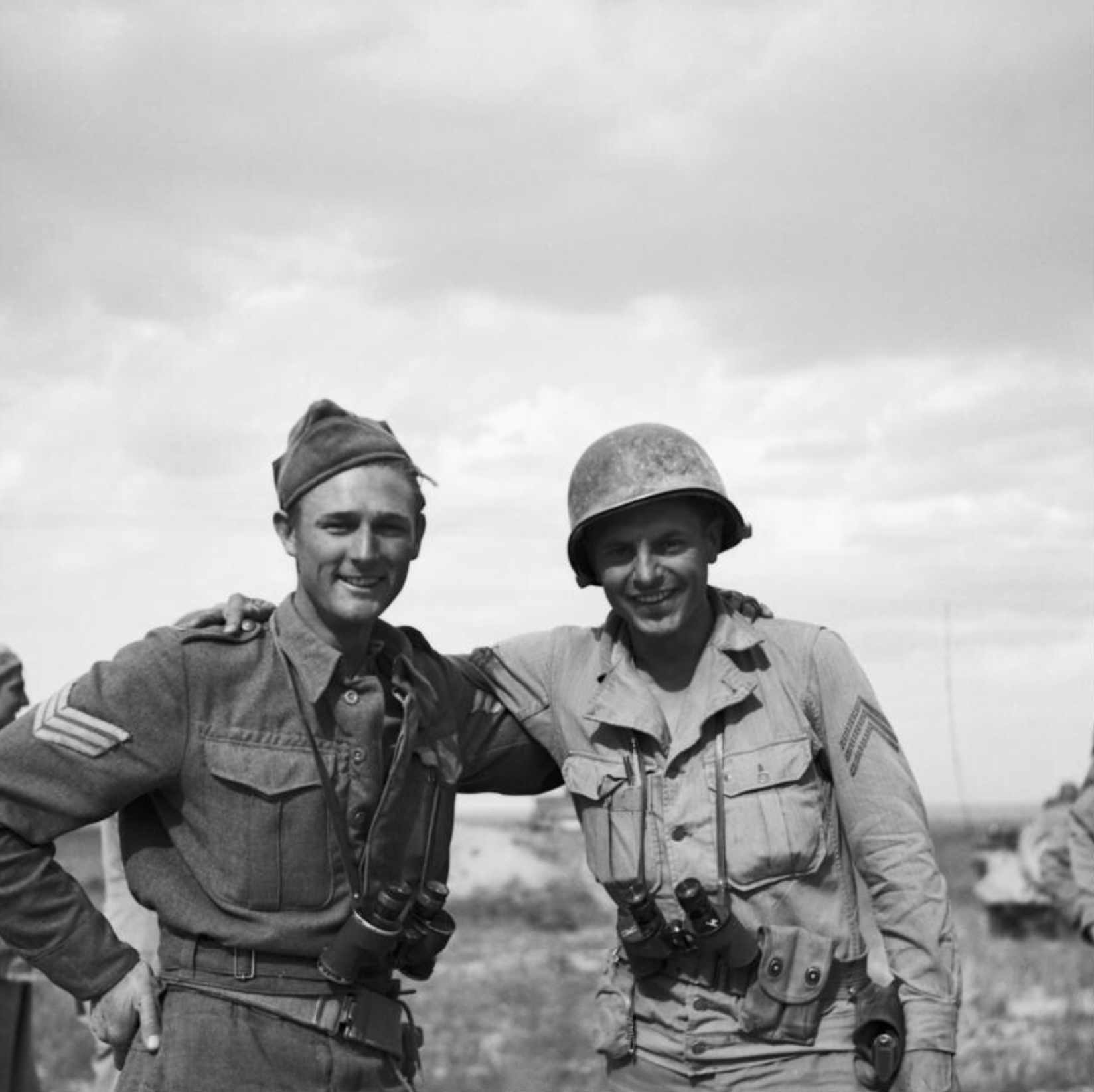 A photograph taken in April 1943 showing the first soldiers to meet from the British Eighth Army (Lance Sergeant Brown) and the 1st US Armored Division (Sergeant A. Randall) as both armies linked-up to attack the remaining Axis armies in Tunisia during the victorious North Africa Campaign of the Second World War (1939-45). (Imperial War Museums)