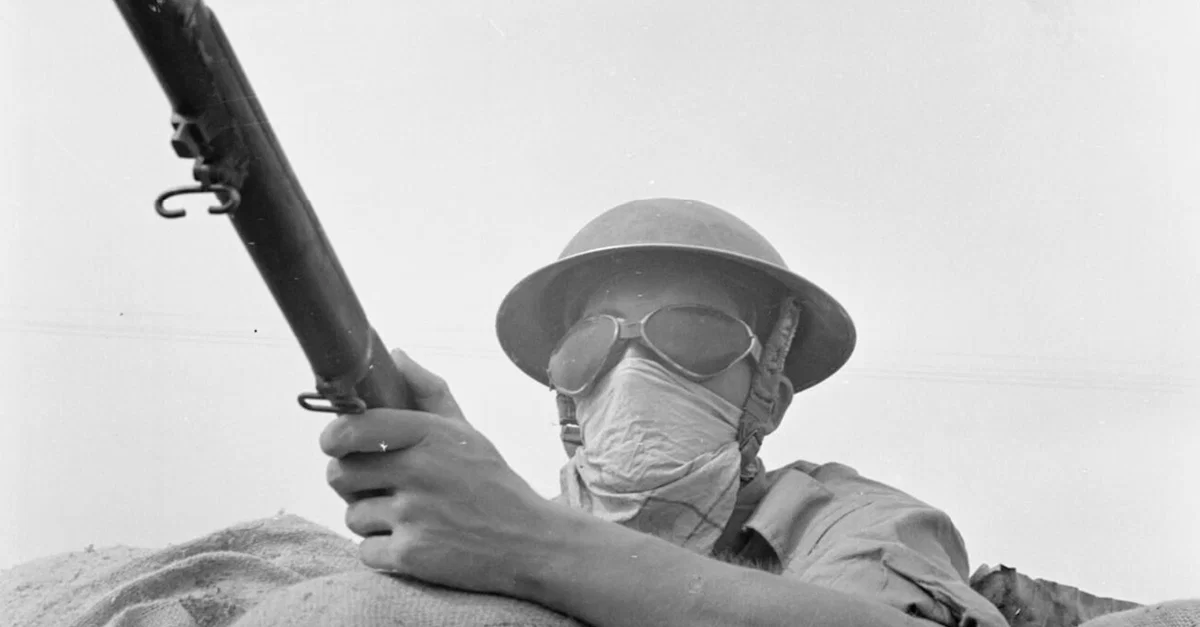 A photograph taken in May 1941 showing a British soldier protecting himself against a sandstorm during the Western Desert Campaigns in North Africa during the Second World War (1939-45). (Imperial War Museums)