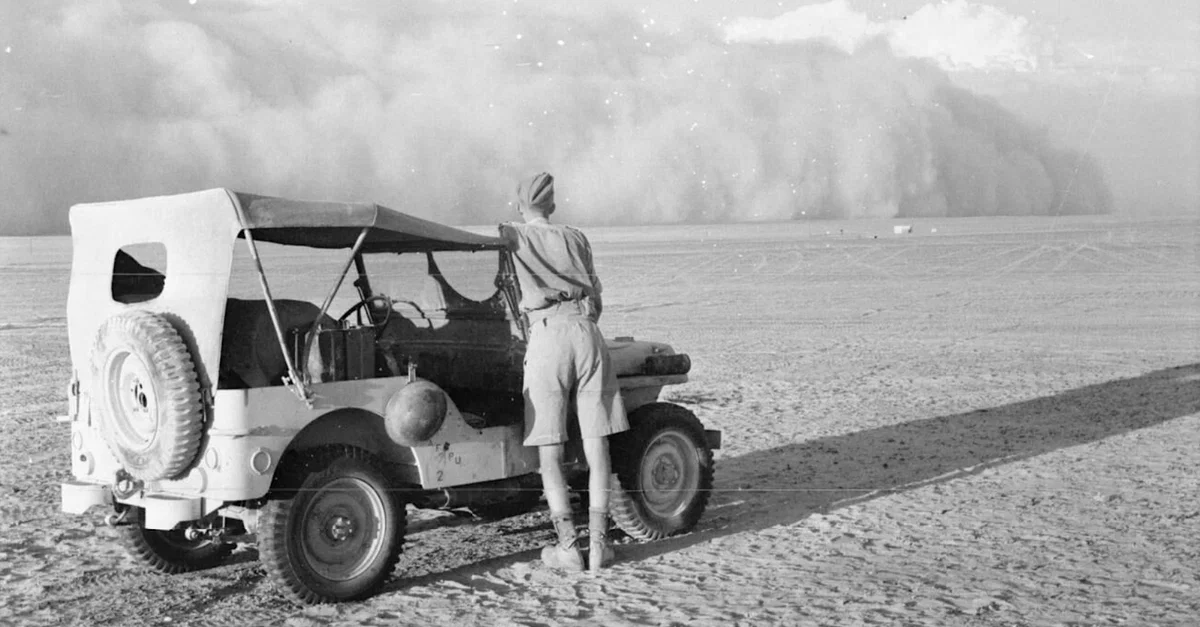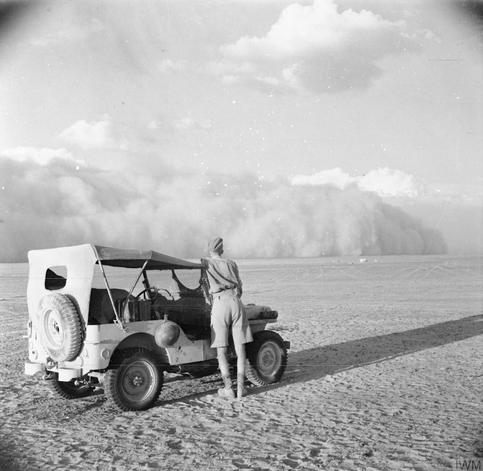 A photograph taken in October 1942 showing a British soldier watching the approach of a sandstorm in the Western Desert Campaigns in North Africa during the Second World War (1939-45). (Imperial War Museums)