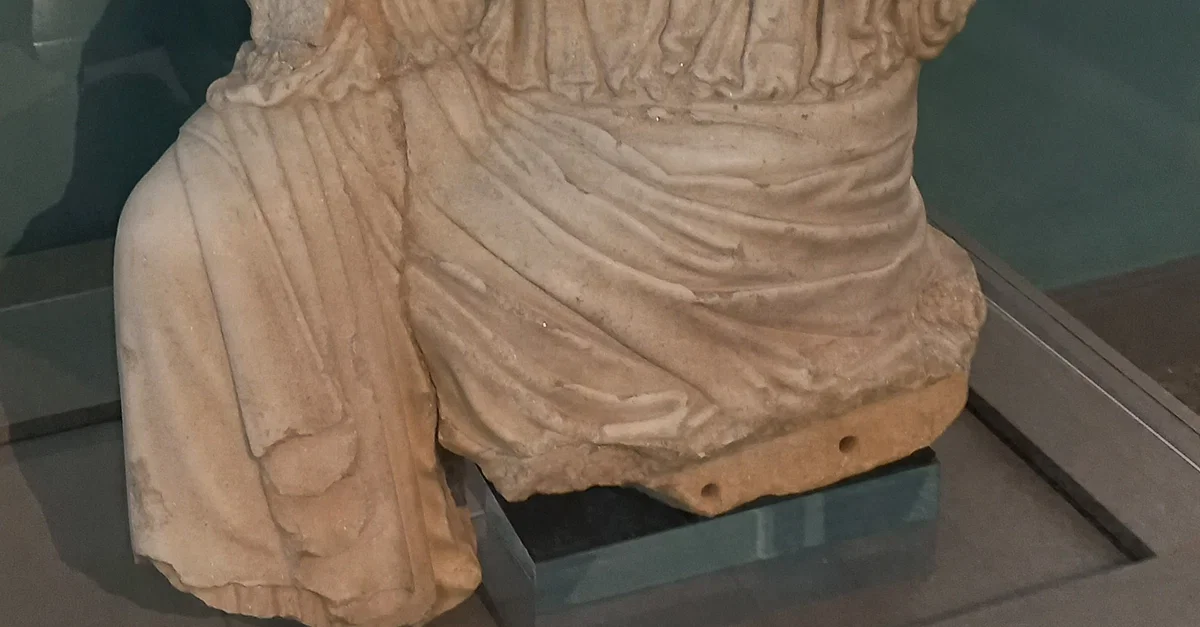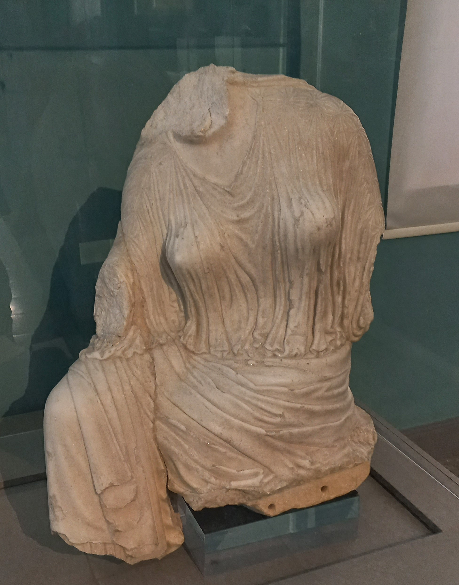 This marble torso of a seated woman in sophisticated drapes, with a height of 85 cm, was retrieved from the ruins of the Persepolis Treasury during its excavations in 1936. Her head, hands, and legs were lost, her torso broken into three pieces and found in different parts of the building. The overall signs of invasion, damage, and burning left little doubt about dating the end of the statue's usage in one piece as 330 BCE, in close connection with the sack of Persepolis by Alexander the Great.