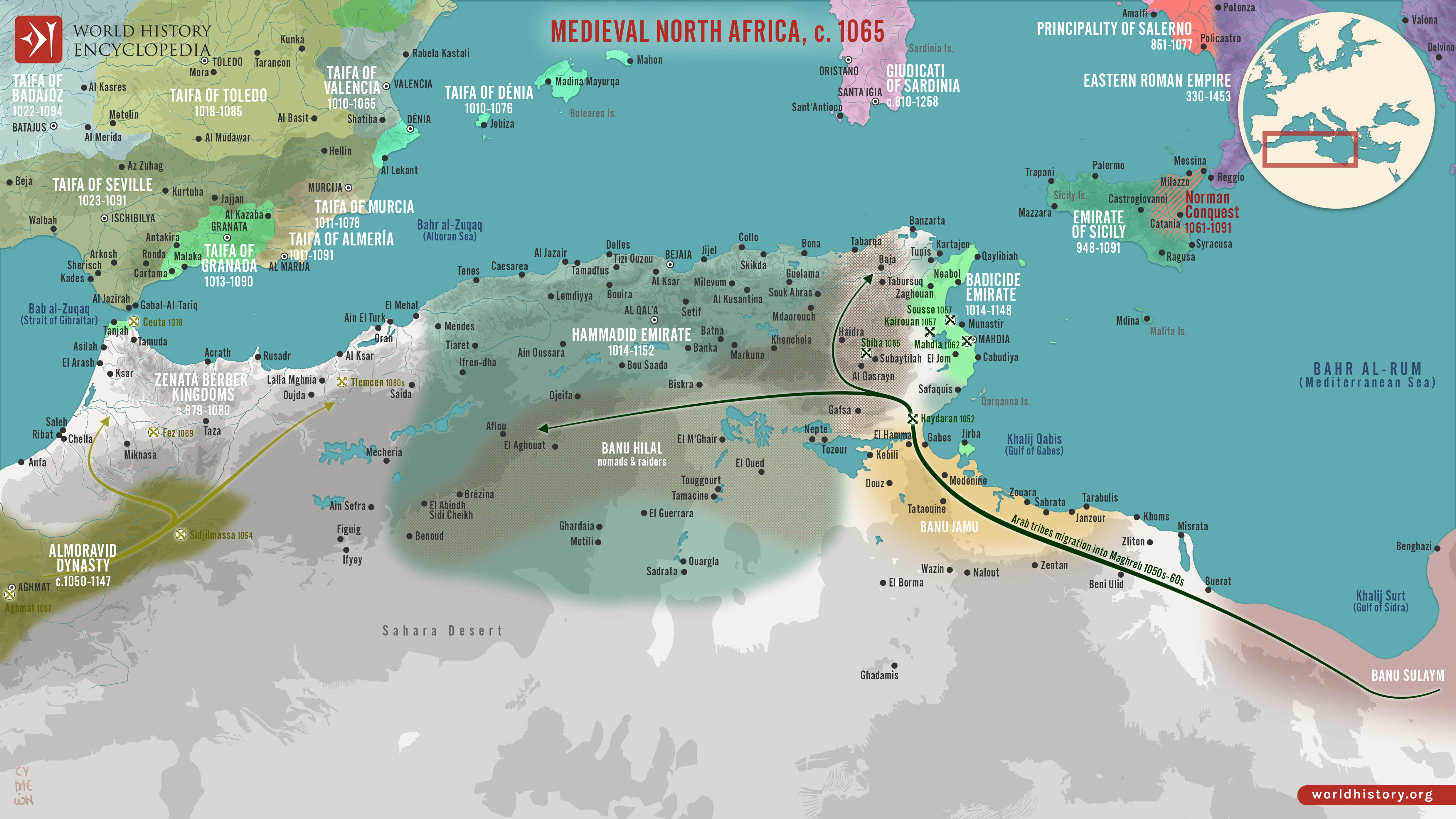 Netchev, S. (2026, January 03). Map of North Africa and the Western Mediterranean c. 1065: Power Shifts in the Post-Caliphate Maghreb. World History Encyclopedia. https://www.worldhistory.org/image/19431/map-of-north-africa-and-the-western-mediterranean/