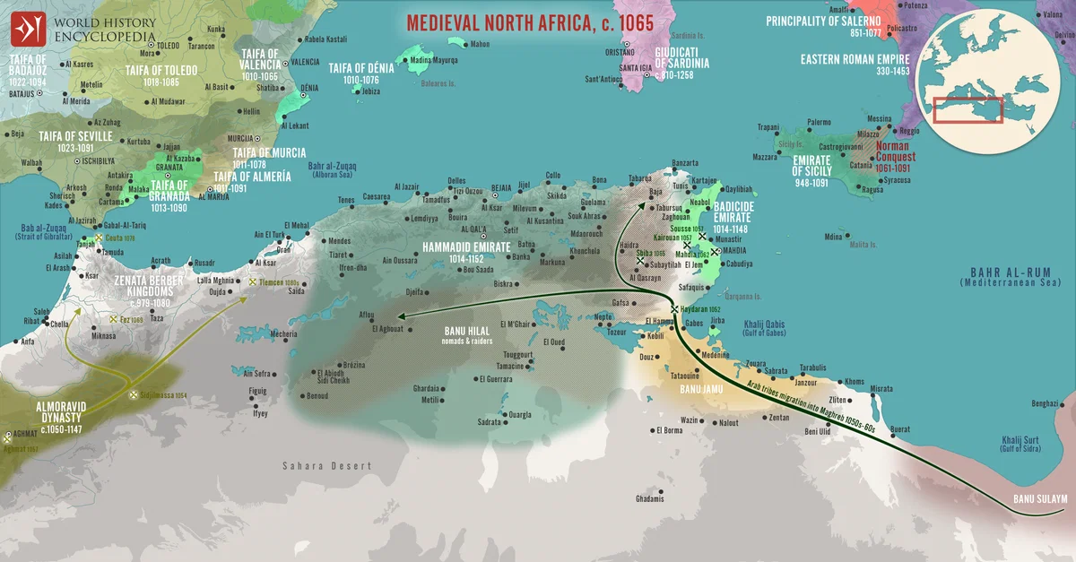 Around 1065, the geopolitical landscape of North Africa and the western Mediterranean was marked by fragmentation, migration, and the rise of new regional powers. Older political structures were weakening, while emergent dynasties and mobile confederations reshaped the balance of power. This period illustrates how environmental pressures, religious alignments, and shifting imperial loyalties combined to produce rapid and often destabilizing change across the medieval Mediterranean world.