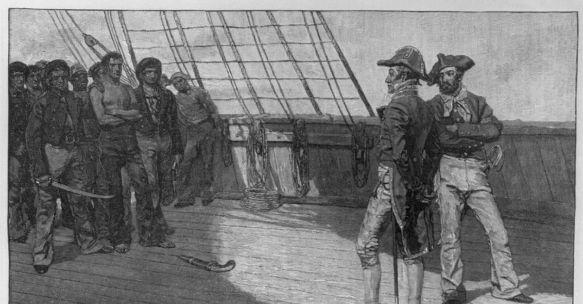 American sailors are impressed into the British Navy, wood engraving after Howard Pyle in Harper's Monthly, 1884.