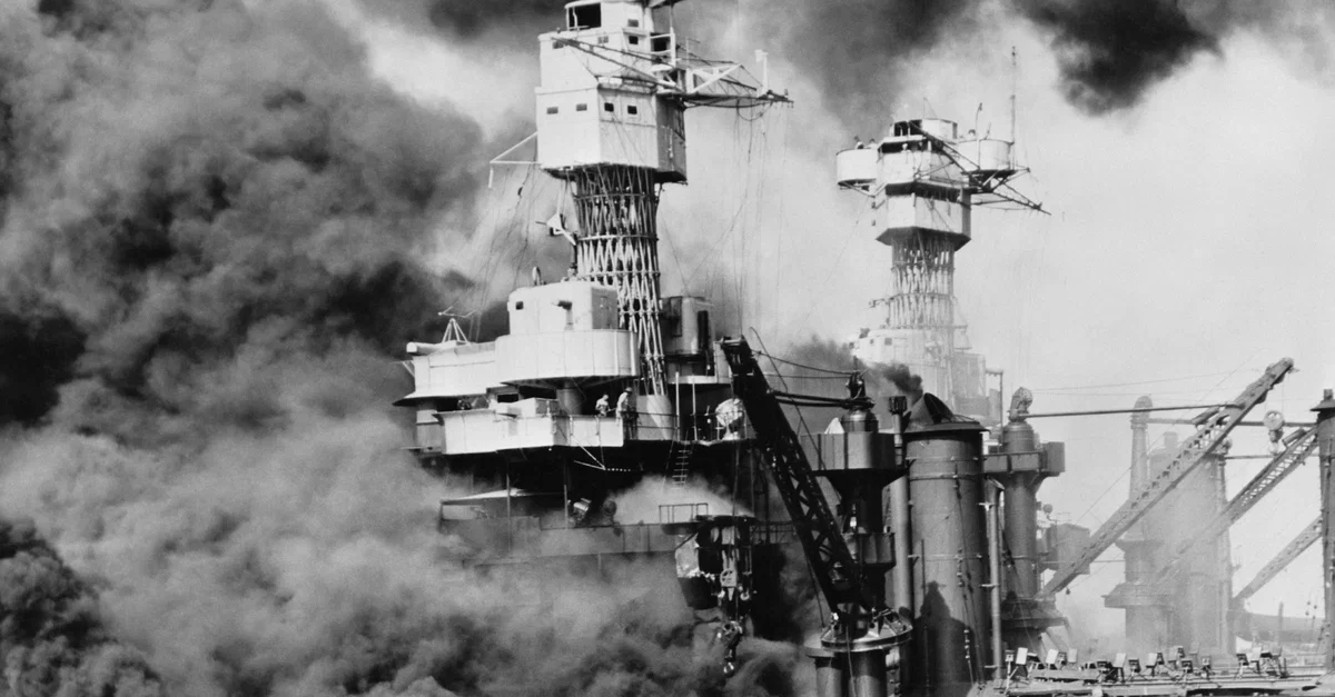 The USS West Virginia was one of seven ships that made up Battleship Row during the Battle of Pearl Harbor in December 1941. Here it can be seen ablaze after being hit by seven torpedoes and two bombs. It sank, and was later returned to service in 1944.