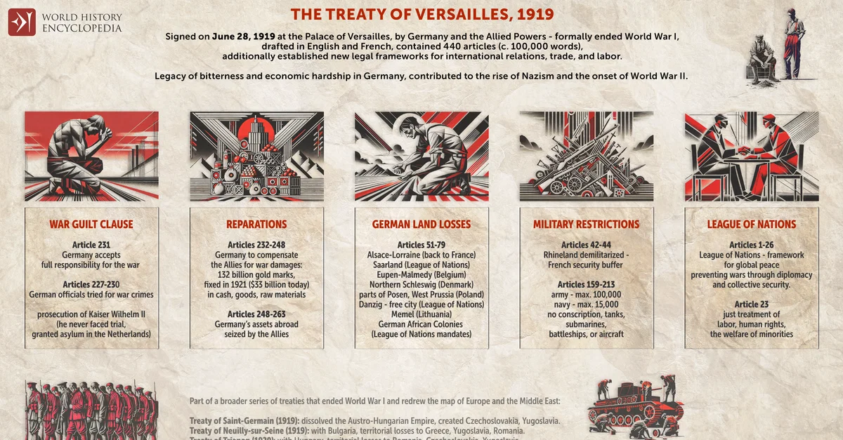 An infographic illustrating the Treaty of Versailles siigned on 28 June, 1919. The treaty, following the armistice of 11 November 1918, formally ended the First World War and imposed severe territorial, military, and financial penalties on Germany, including the loss of key territories, military restrictions and the requirement to pay heavy reparations. It also included the War Guilt Clause, which held Germany responsible for the war. The treaty established the League of Nations, aimed at preventing future conflicts, but its punitive terms contributed to future unrest in Europe.