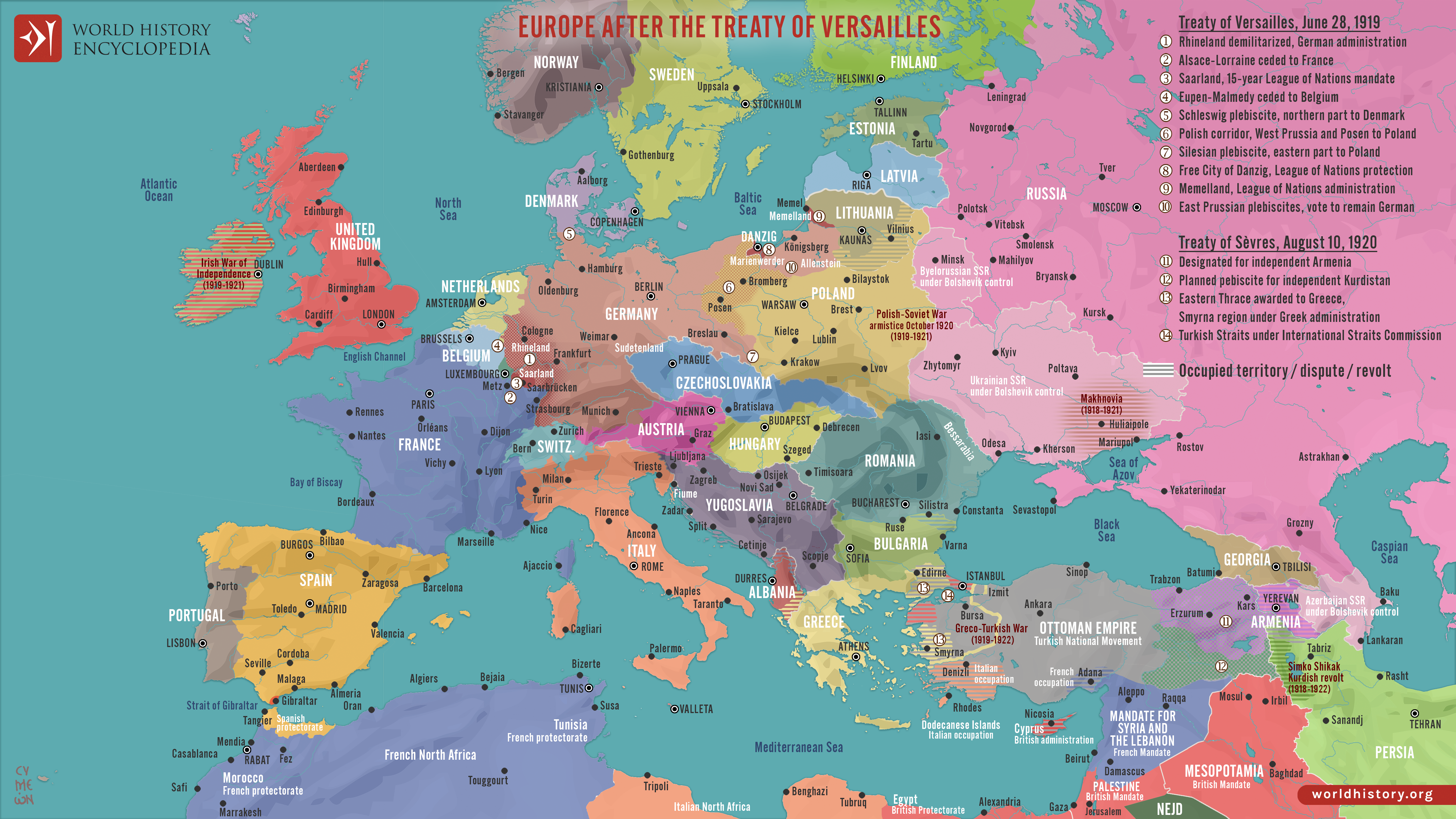 This map illustrates the situation in Europe in November 1920 in the aftermath of First World War (1914-18), as the continent was reshaped by the Treaty of Versailles (1919) and the Treaty of Sèvres (1920). The German Empire had collapsed, with Germany forced to cede territories, pay reparations, and accept military restrictions. New states like Poland, Czechoslovakia, and Yugoslavia emerged from the former Austro-Hungarian Empire. The Ottoman Empire was dismantled under the Treaty of Sèvres, losing vast territories in the Middle East and Europe, with Turkey reduced to Anatolia and Istanbul. Under the League of Nations’ mandate system, France and Britain gained control over former Ottoman territories, particularly in the Middle East. Having undergone the Bolshevik Revolution, the Russian Empire was in civil war, while Italy and other countries experienced internal unrest due to unfulfilled wartime promises. Europe’s political landscape was fragile, marked by territorial adjustments, nationalist movements, and widespread economic instability.