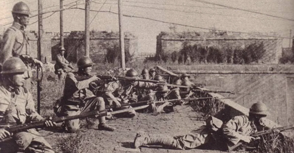 A photograph showing Japanese troops at the Mukden Little West Gate during the invasion of Chinese Manchuria (Manchukuo) in September 1931. The invasion caused a crisis with the League of Nations.