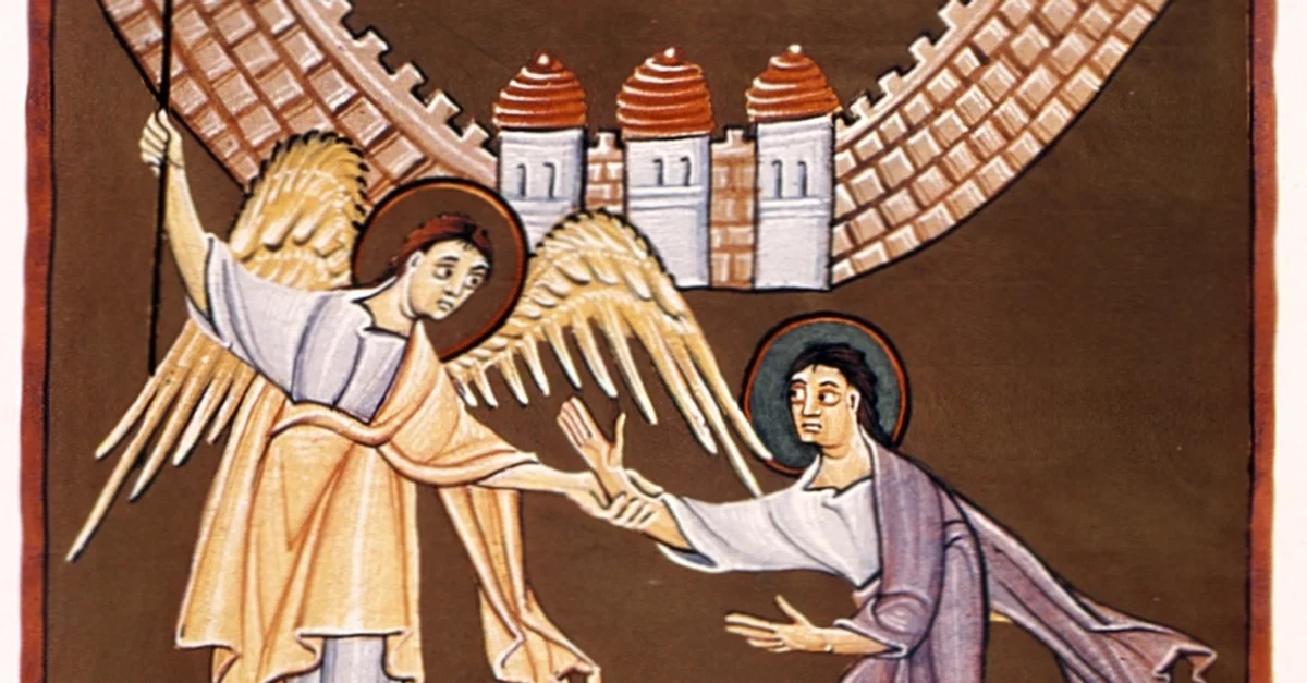 The vision of a new Jerusalem as described in the book of Revelation, folio 55 recto, MS A. II. 42, Bamberger Apokalypse, c. 1000.