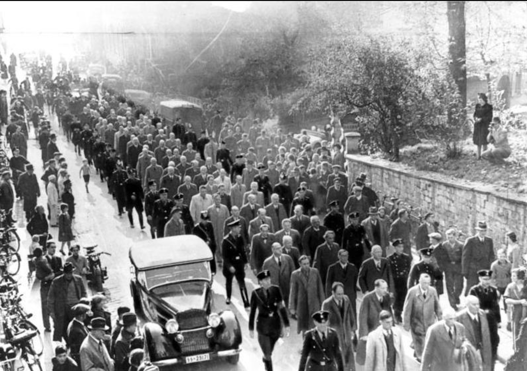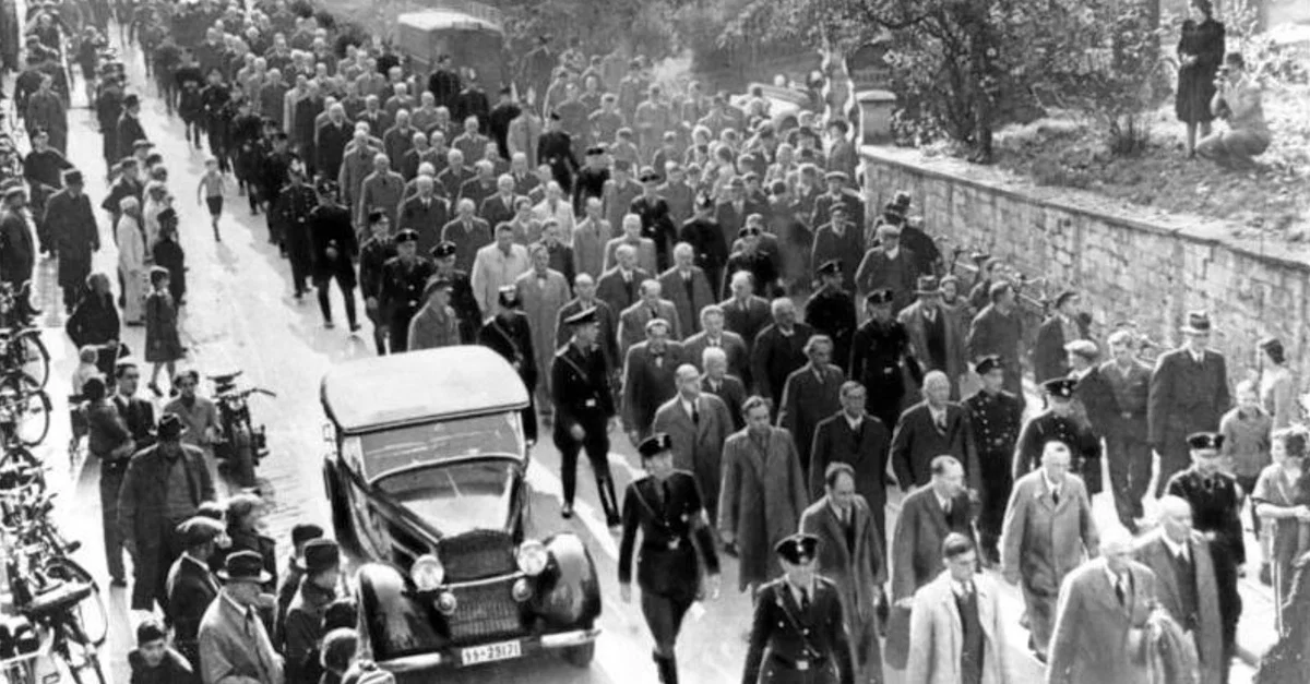 A November 1938 photograph showing Jews under mass arrest in Baden-Baden, Germany. The Nazis orchestrated Kristallnacht (‘Night of Broken Glass’), an attack on Jews and Jewish property across Germany and Austria on 9-10 November, 1938, and followed this up with mass arrests of Jews for deportation via concentration camps. (German Federal Archives)