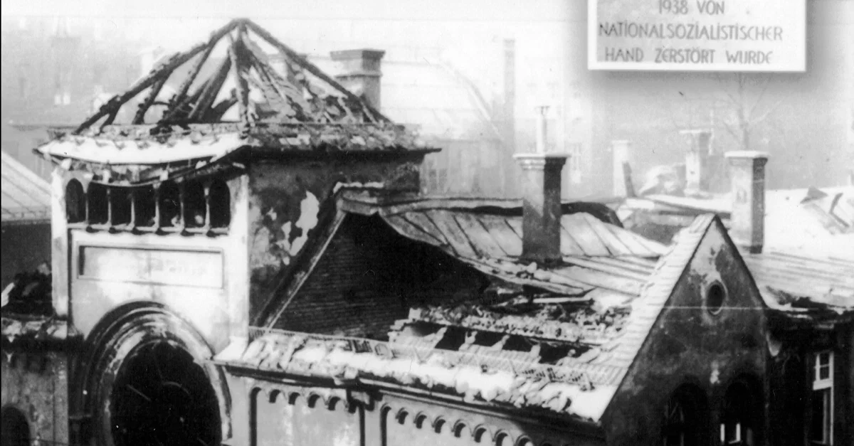 A 1938 photograph of the ruined Ohel Yaakov synagogue in Munich, Germany. The Nazis orchestrated Kristallnacht (‘Night of Broken Glass’), an attack on Jews and Jewish property across Germany and Austria on 9-10 November, 1938, and followed this up with mass arrests of Jews for deportation via concentration camps. (Private Collection)