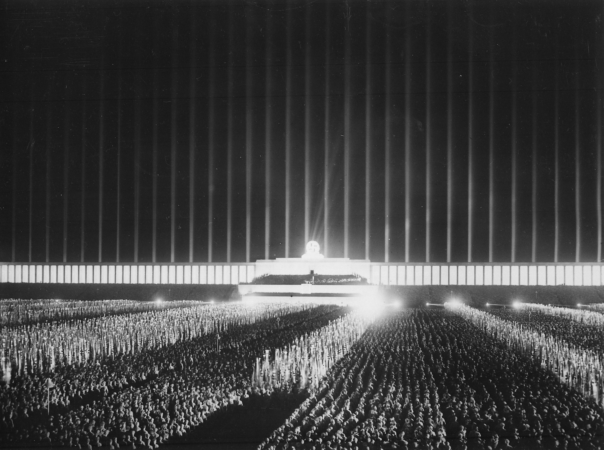 A 1937 photograph showing the dramatic stage lighting used at the Nuremberg rallies in Nazi Germany. (National Archives at College Park)