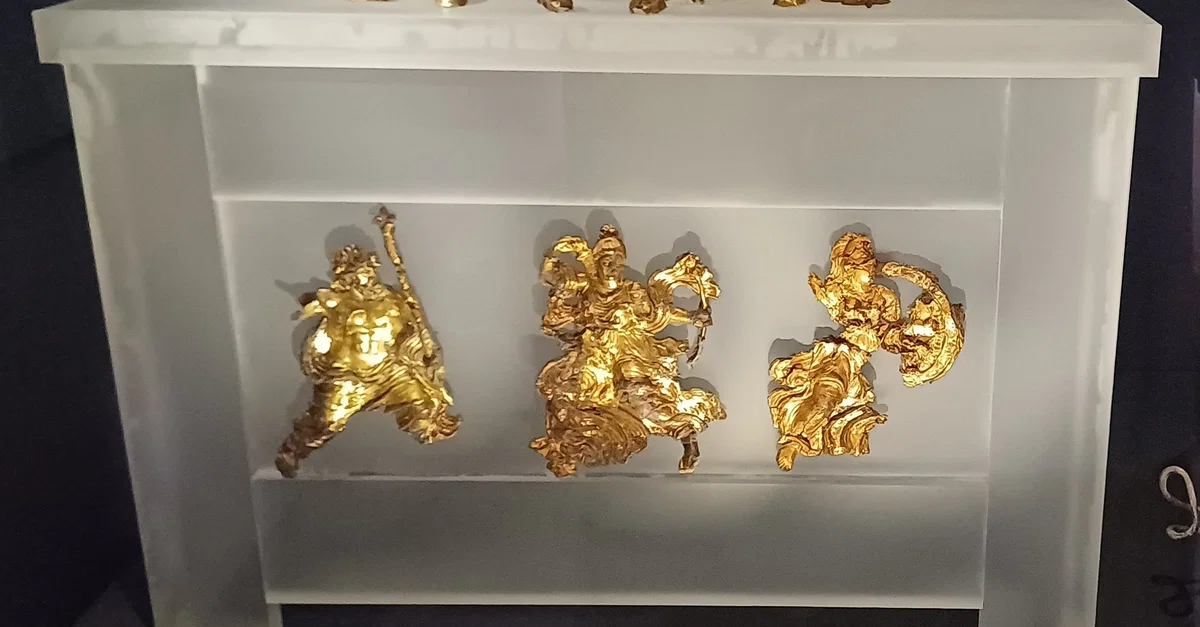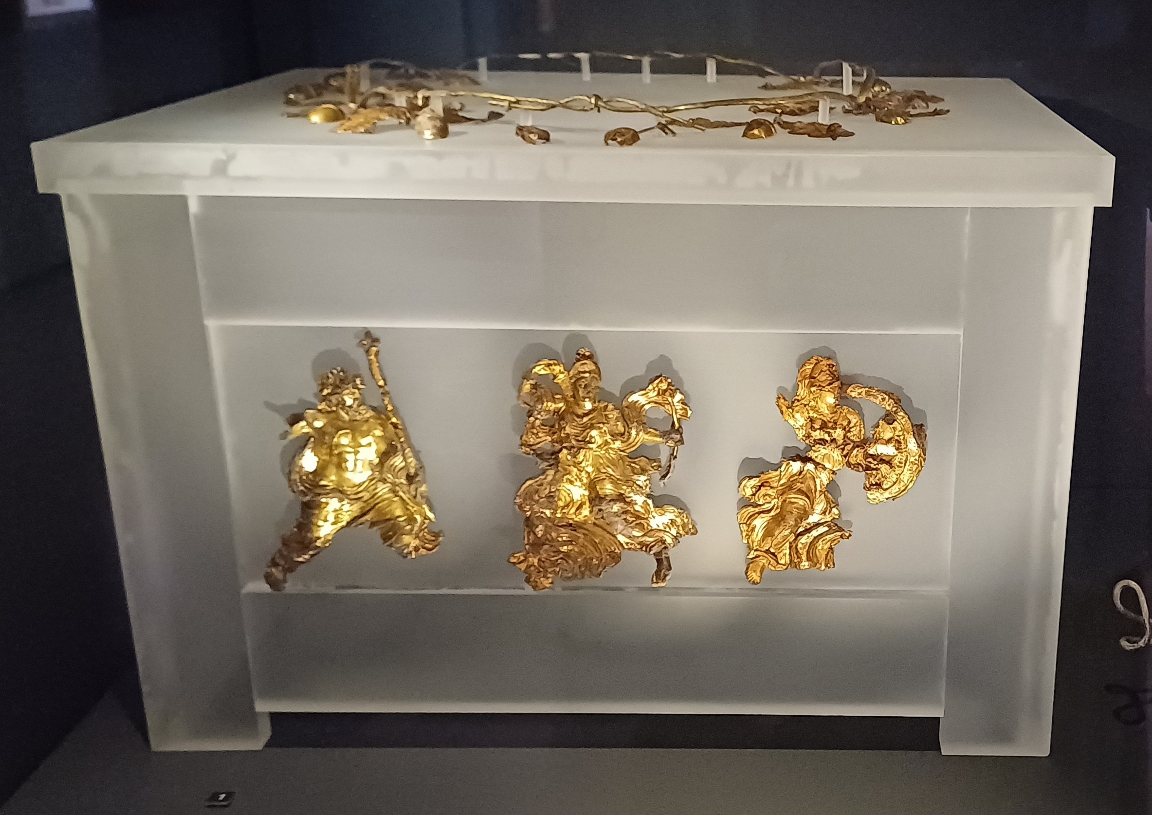 The necropolis on the north of Pydna has given out several Macedonian burial cist-chambers. The Macedonians used gilt silver figurines of deities – here representing Zeus, Artemis, and Athena – as grave goods to decorate the burial caskets that preserved the bones after cremation. The gold crown of oak leaves, the ceremonial headgear demonstrating the owner's significance, was placed on the casket, which in this case was made of wood and therefore did not last.