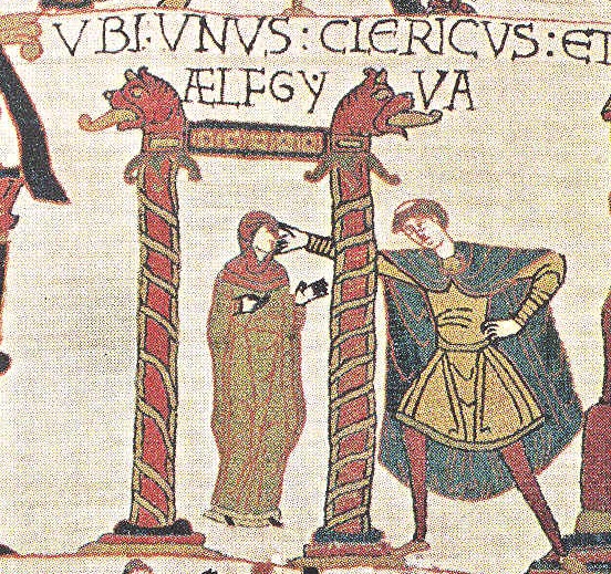 A woman named Aelfgifu with a clergyman, depicted on the Bayeux Tapestry, made c. 1067-1079. The identity of Aelfgifu is unclear, and the name was common among Old English royal women. Two leading candidates for being the Aelfgifu in this image are Emma of Normandy (who went by the English name Aelfgifu) and Aelfgifu of Northampton.