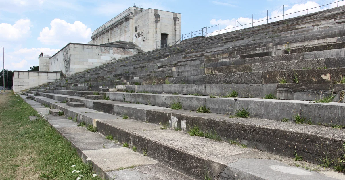 A 2018 photograph showing the ruins of what was once the stage area for the Nuremberg rallies in Nazi Germany (1927-38).