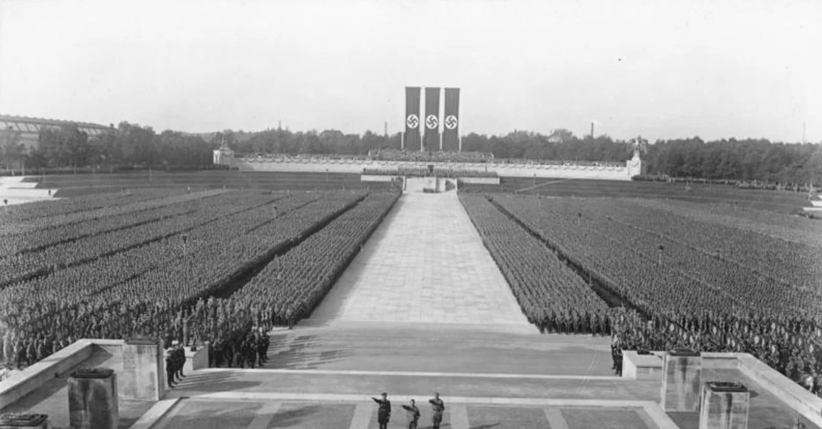 A photograph showing a procession and flag ceremony at the Nuremberg Rally of 1934, the annual rally of the Nazi party. (German Federal Archives)