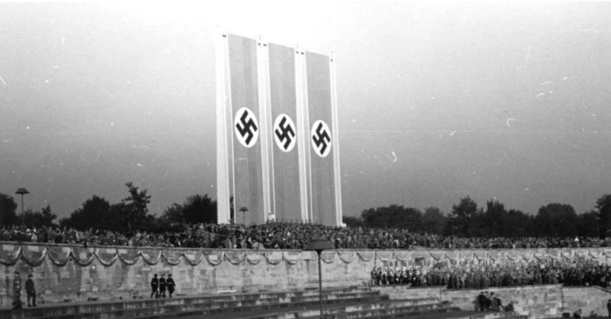 A photograph showing the use of the Nazi flag at the Nuremberg Rally of 1938, the annual rally of the German Nazi party. (German Federal Archives)