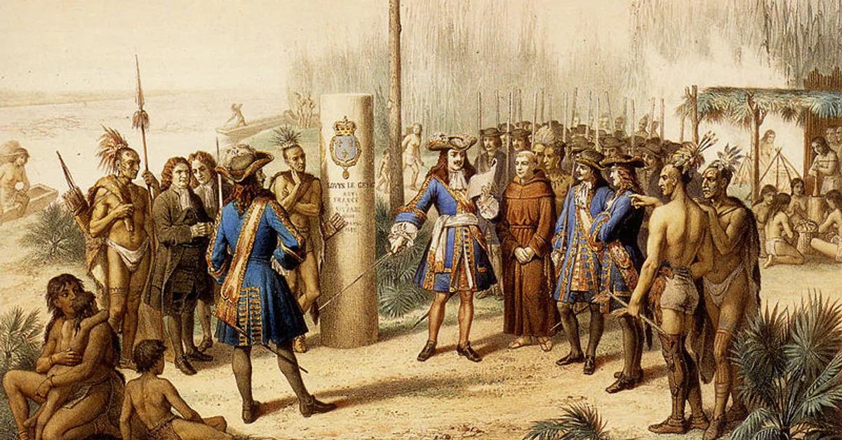 La Salle claims the territory of Louisiana for France after reaching the mouth of the Mississippi River, April 1682. Painting by Jean-Adolphe Bocquin, 1870s.